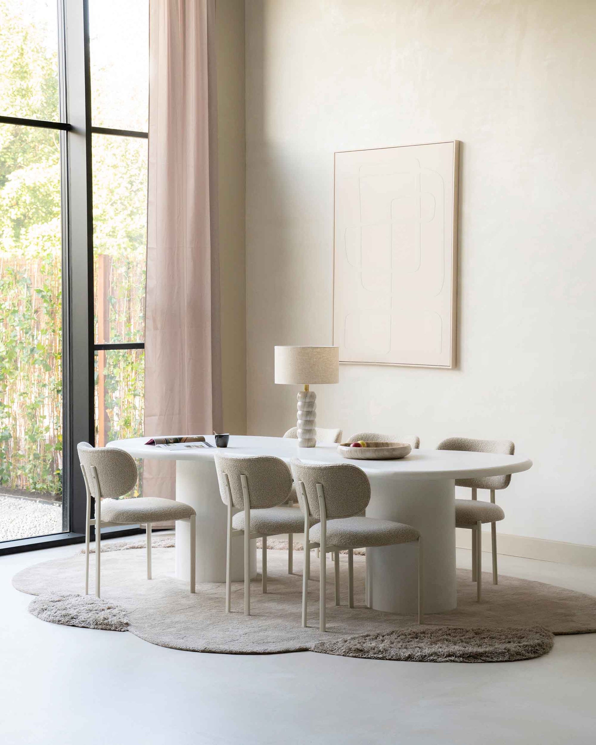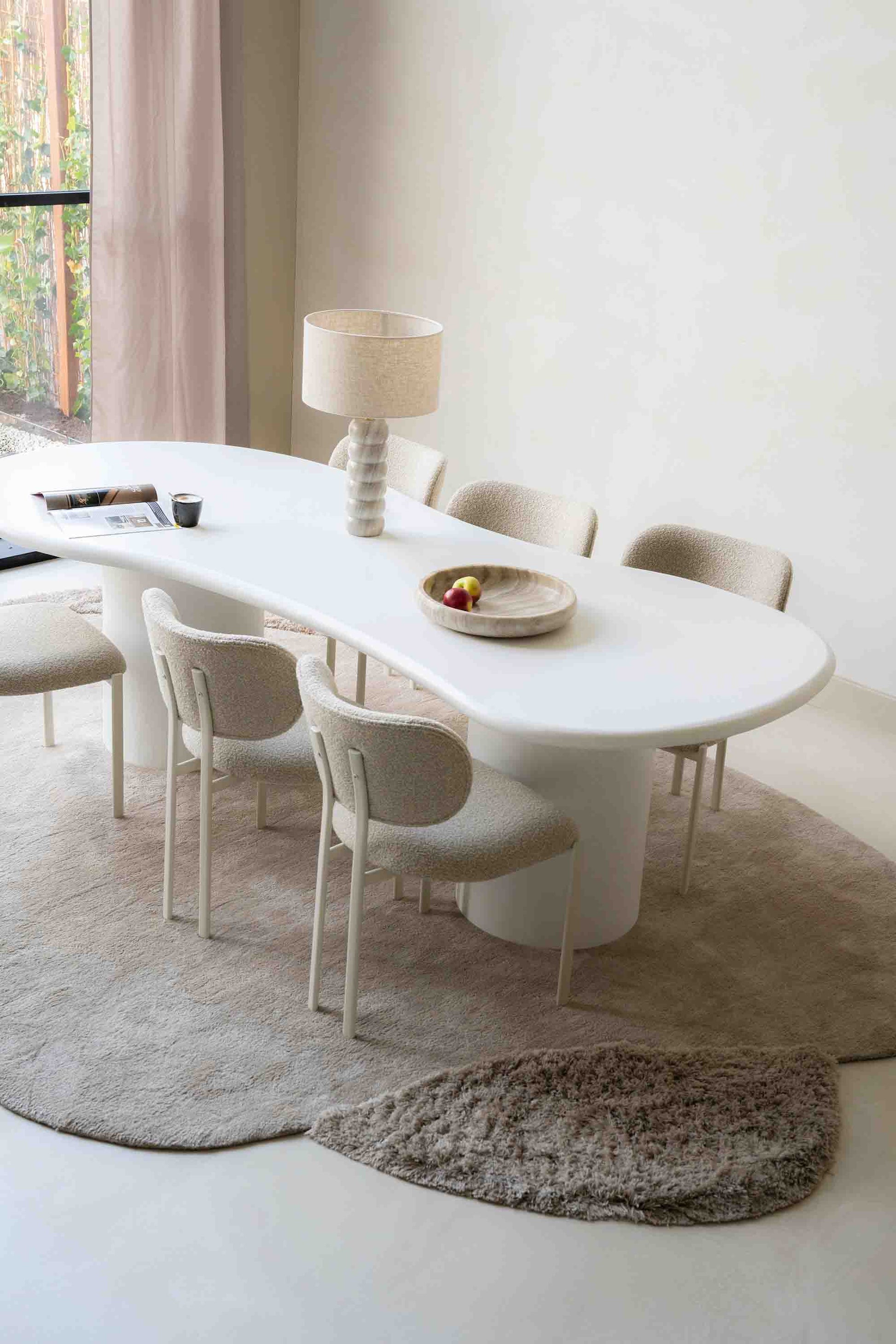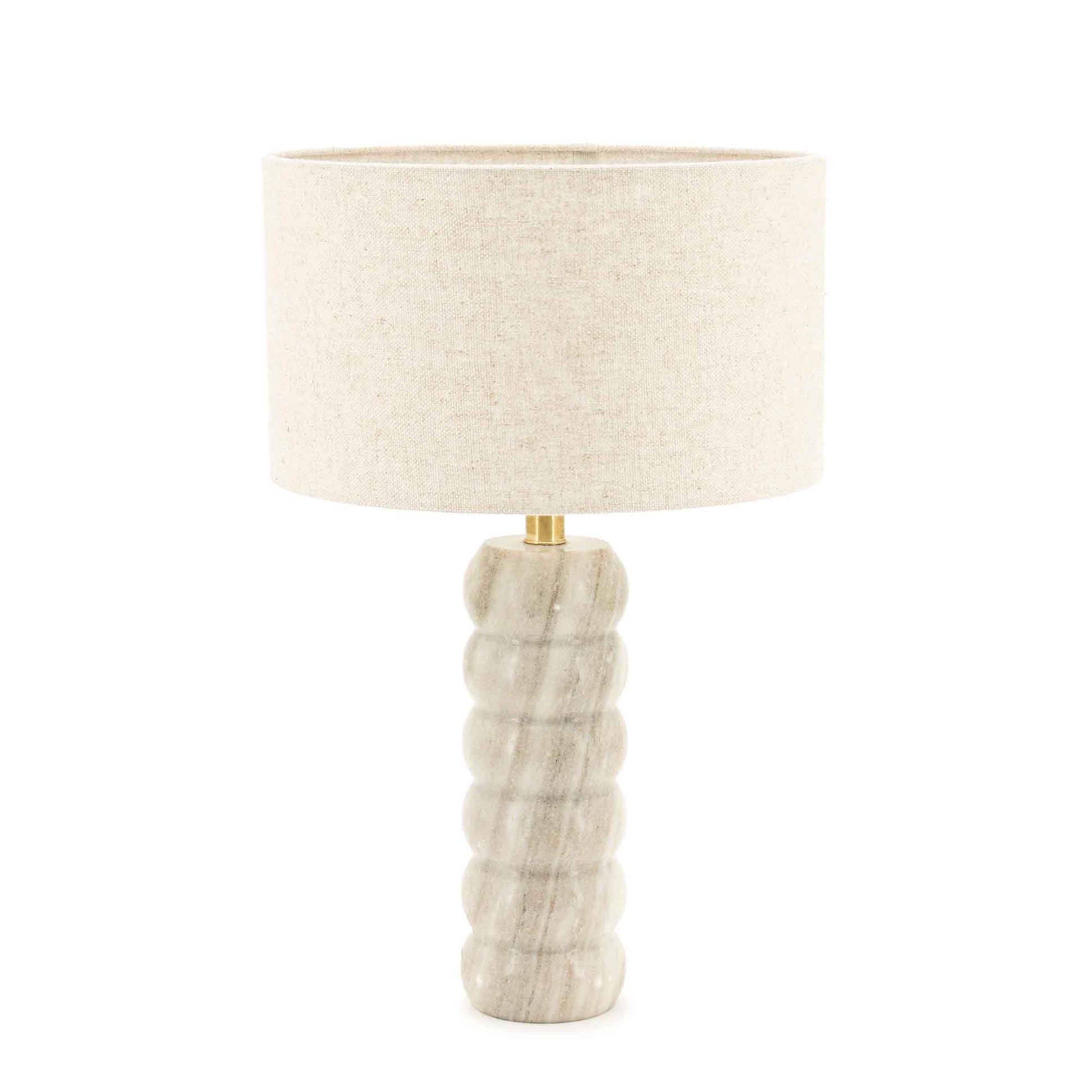 Denne vakre bordlampen kombinerer eksklusiv marmor med en myk, tekstilskjerm i rayon, viskose og lin – en perfekt balanse mellom luksus og naturmaterialer. Den skulpturelle marmorfoten gir lampen et kunstnerisk preg, der de organiske, buede formene skaper et moderne og sofistikert uttrykk.