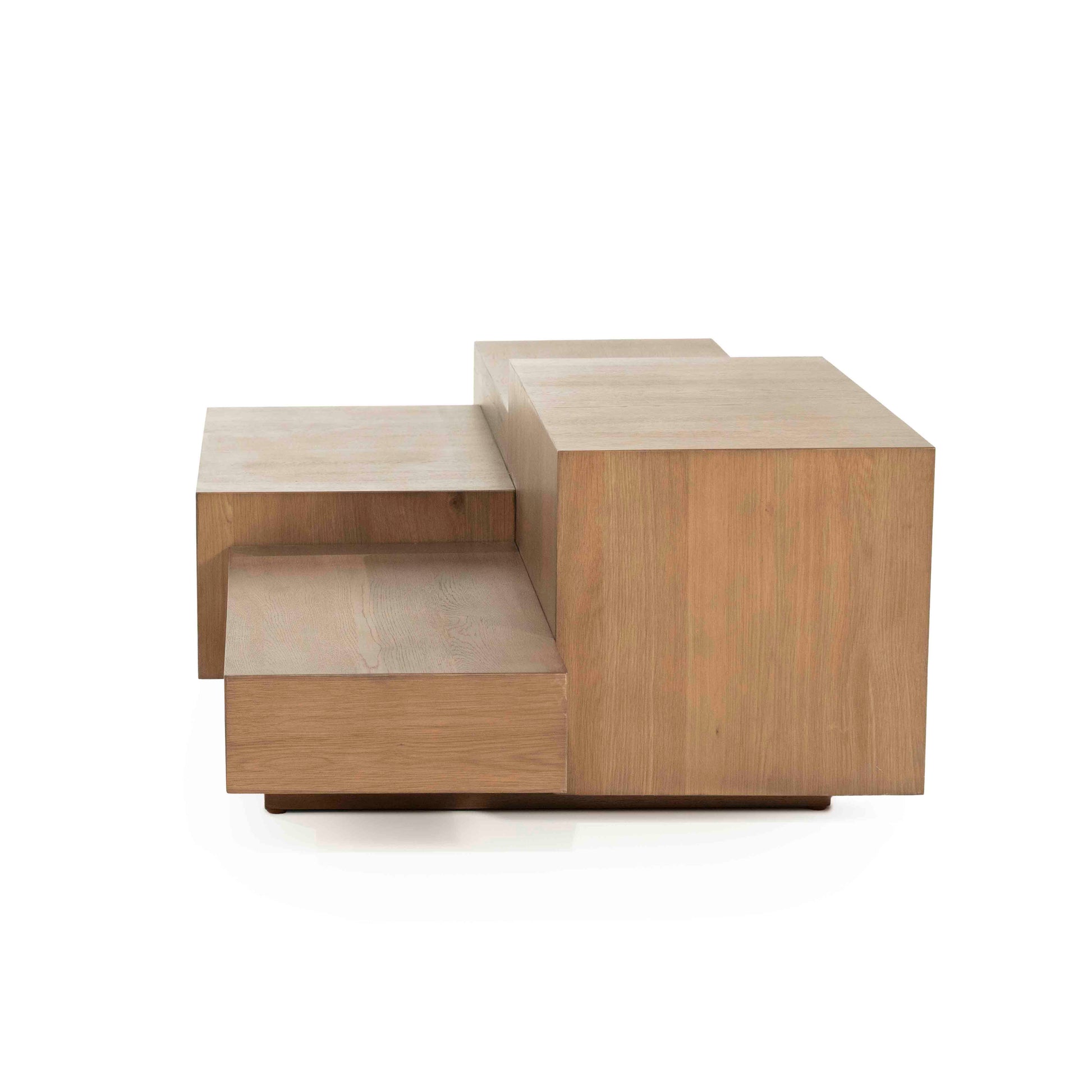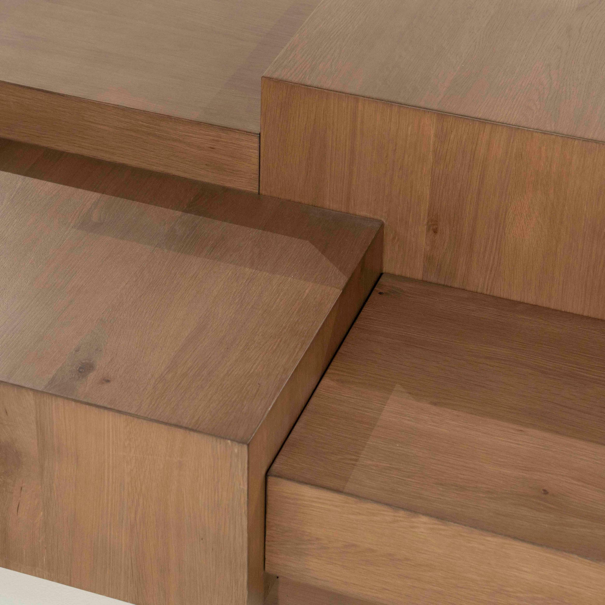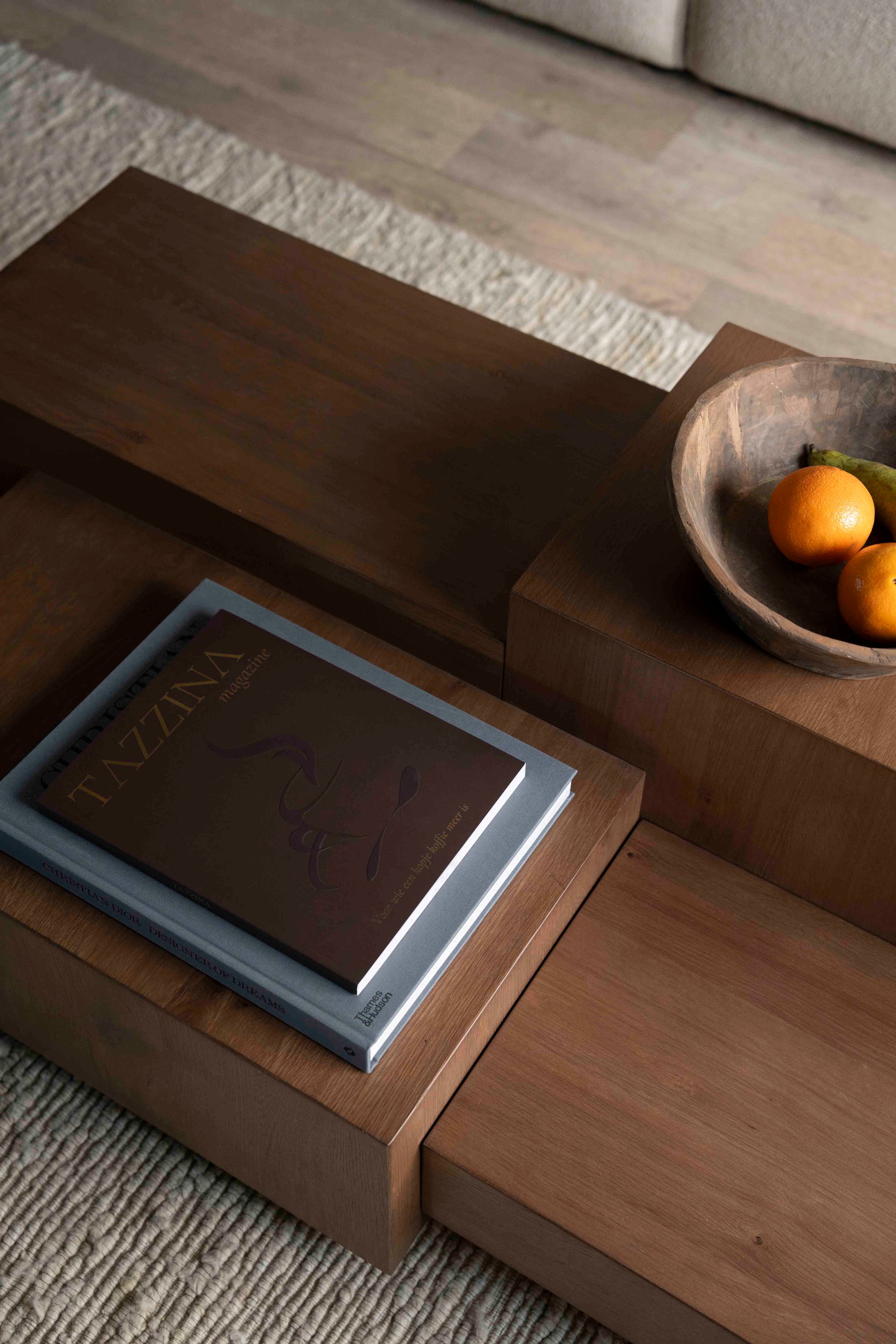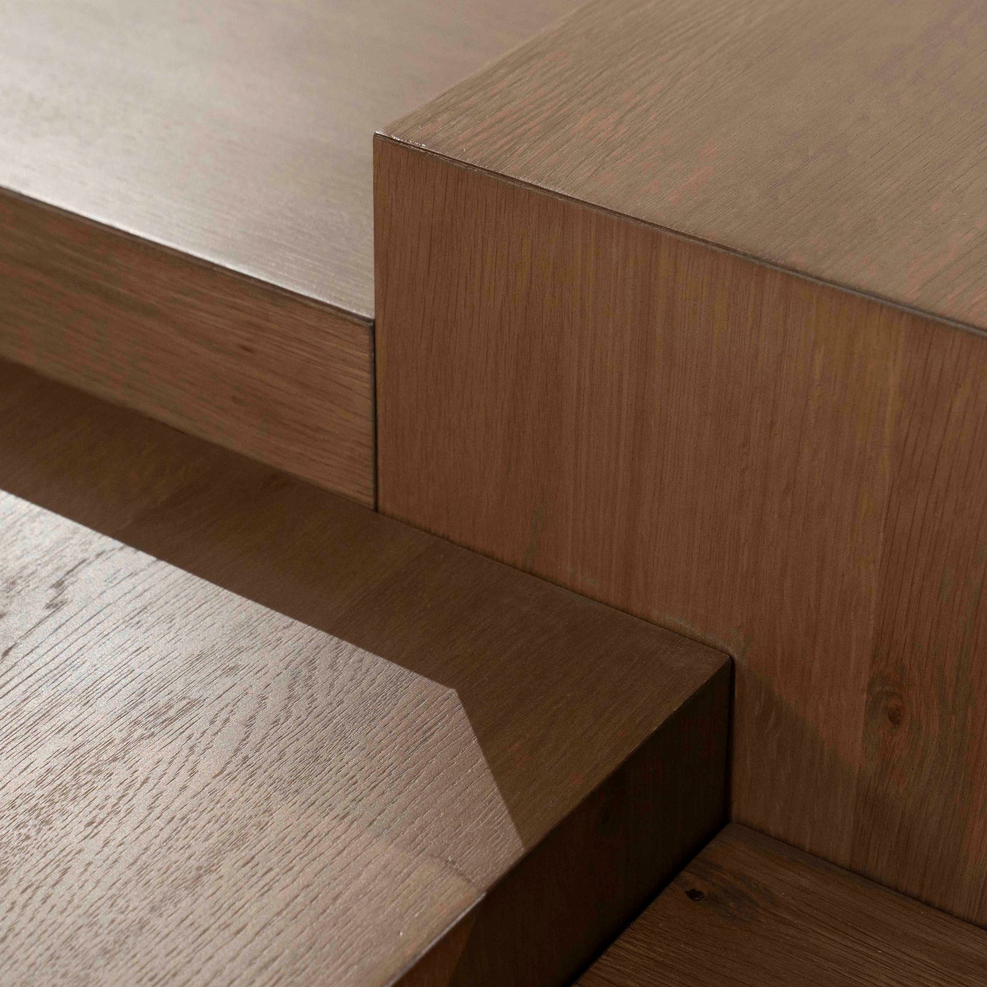 Et unikt salongbord med et spennende, geometrisk design som skaper et blikkfang i rommet. Bordet består av flere kubiske former i varierende høyder som gir en arkitektonisk og leken karakter. Utført i mørk eik med en naturlig overflate som fremhever treets struktur og varme tone. Perfekt som et statement-bord i moderne og stilrene interiører.