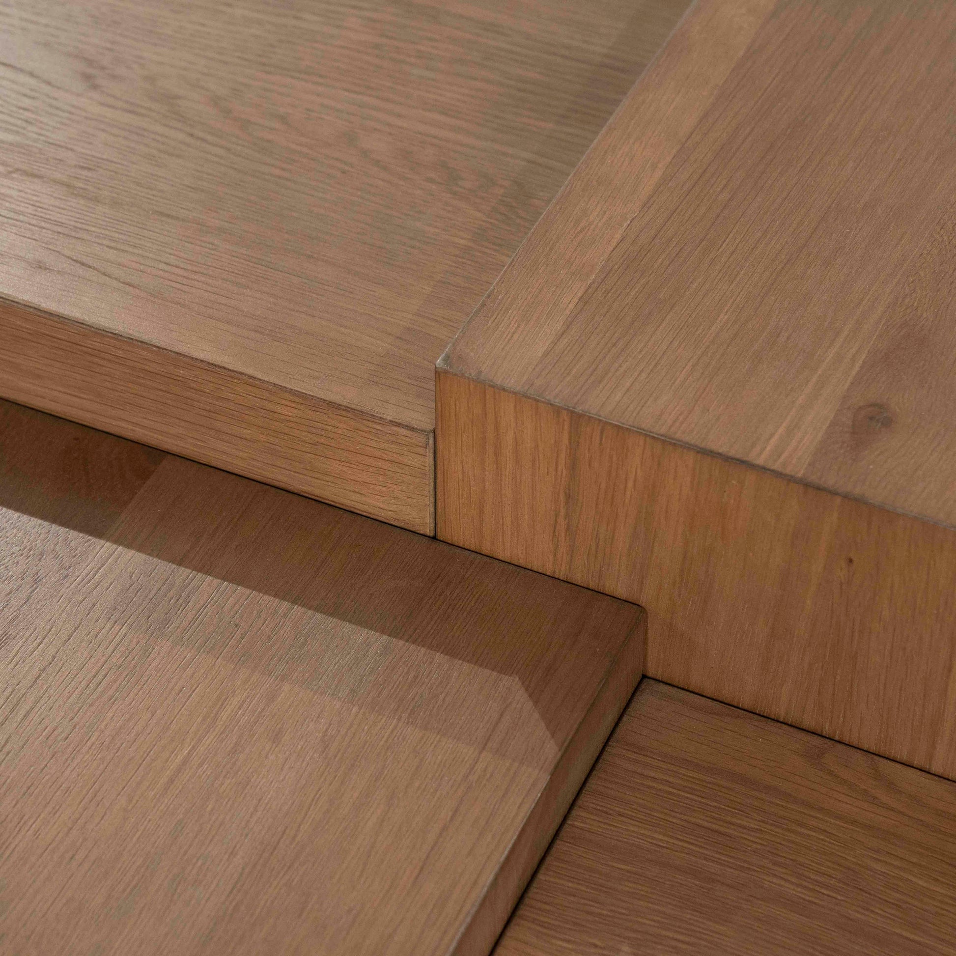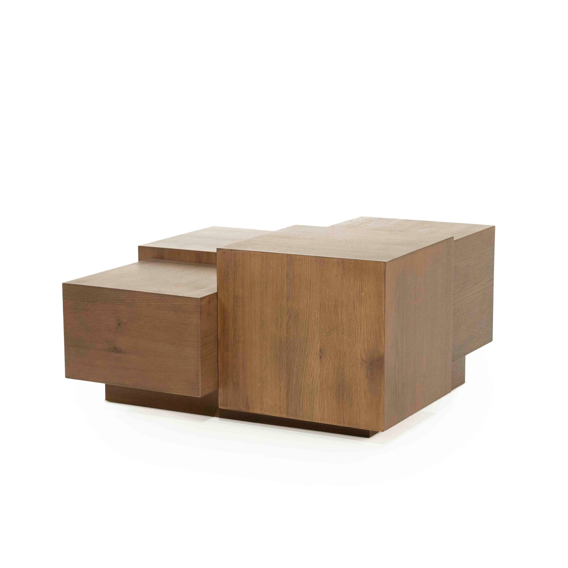 Et unikt salongbord med et spennende, geometrisk design som skaper et blikkfang i rommet. Bordet består av flere kubiske former i varierende høyder som gir en arkitektonisk og leken karakter. Utført i mørk eik med en naturlig overflate som fremhever treets struktur og varme tone. Perfekt som et statement-bord i moderne og stilrene interiører.