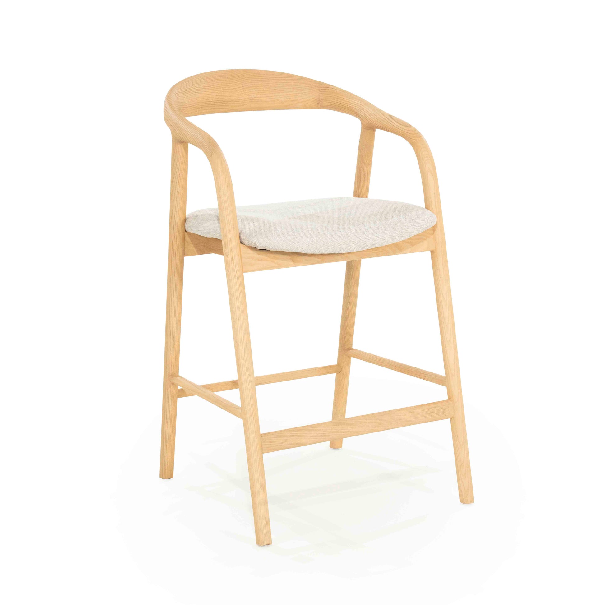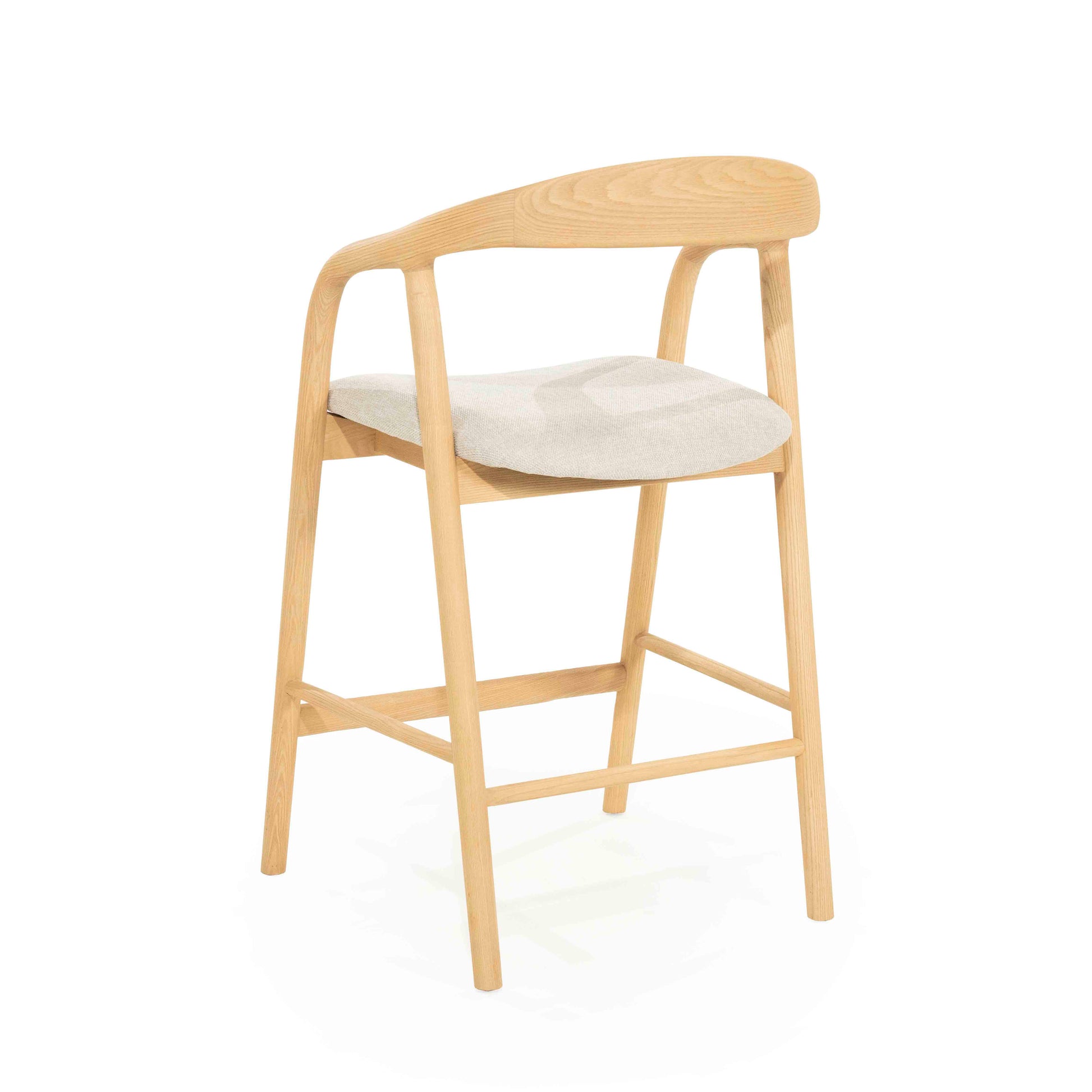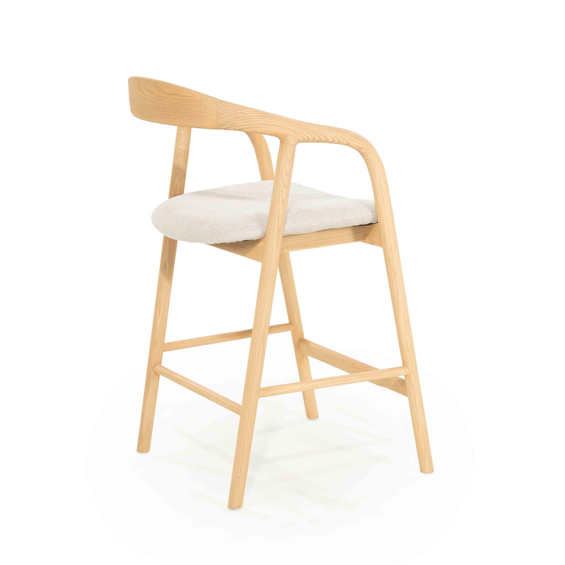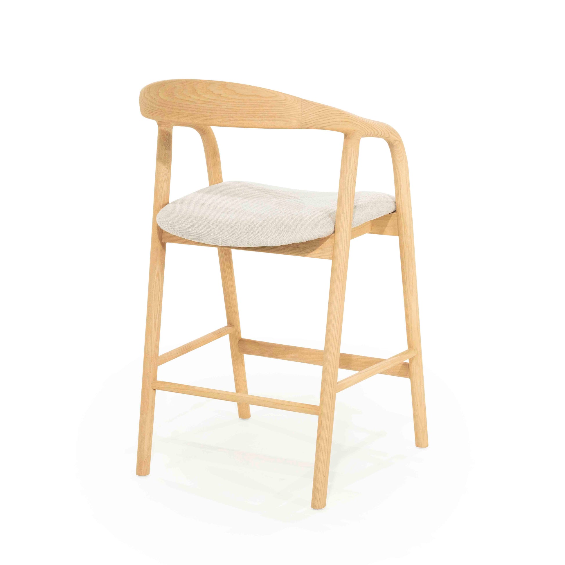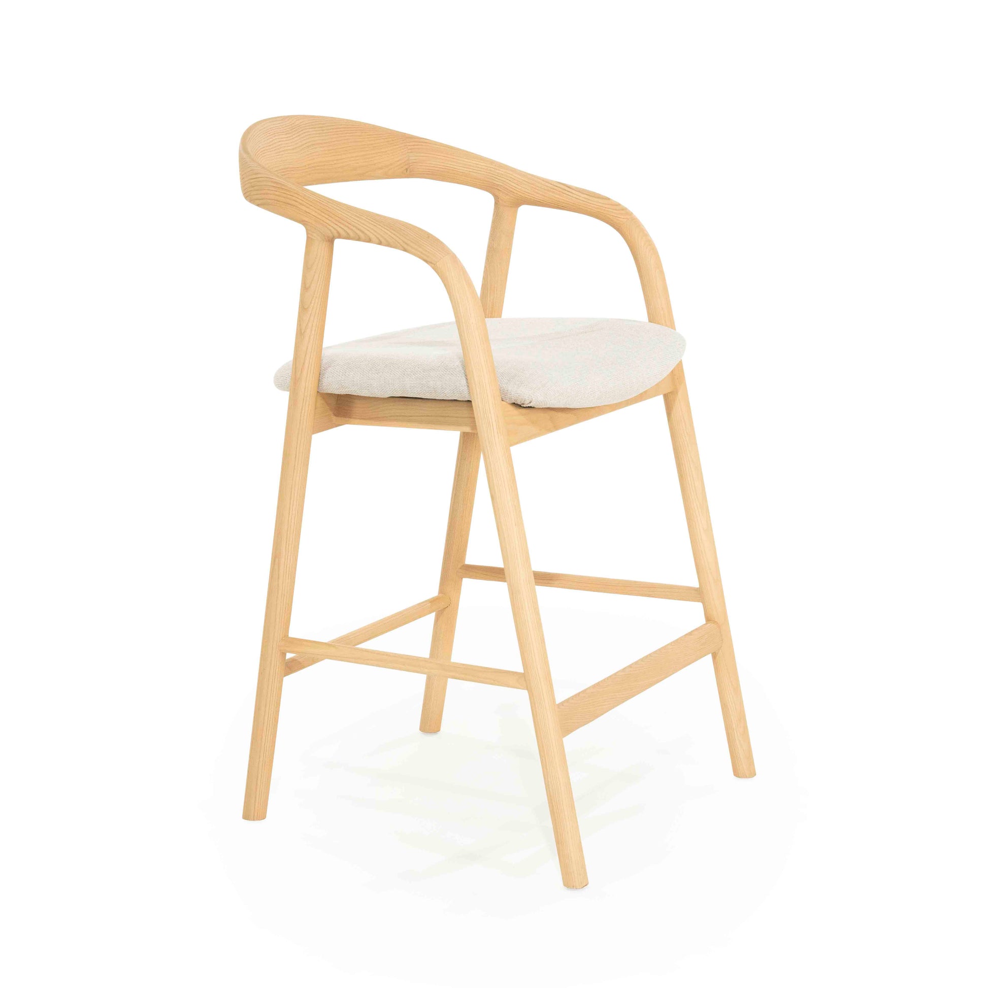 Stilren barstol i lyst treverk med avrundede former og behagelig sete i lyst tekstil. Den buede ryggen gir god støtte, mens den enkle, lette konstruksjonen skaper et moderne og luftig uttrykk. Perfekt til kjøkkenøyen eller barløsningen i stuen.