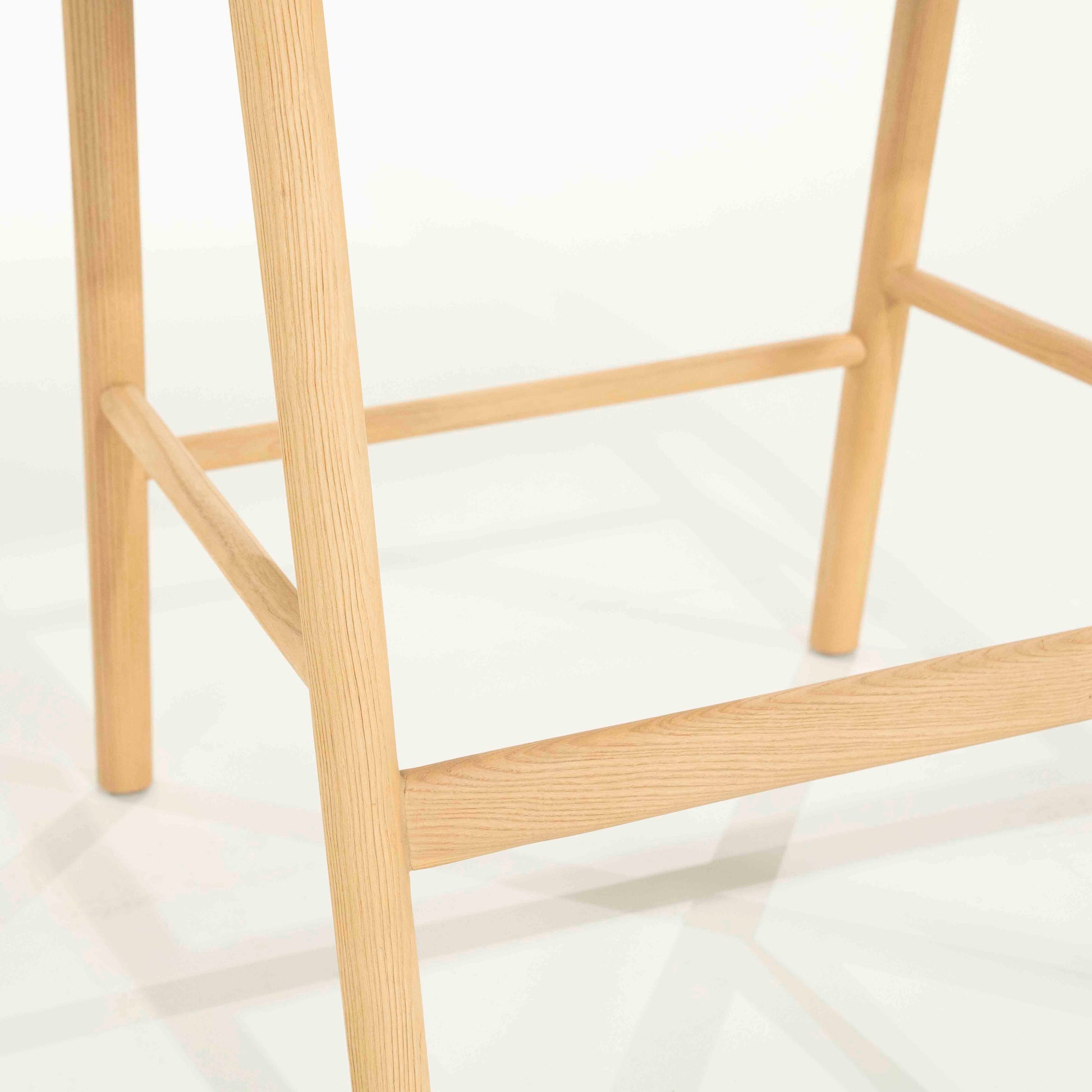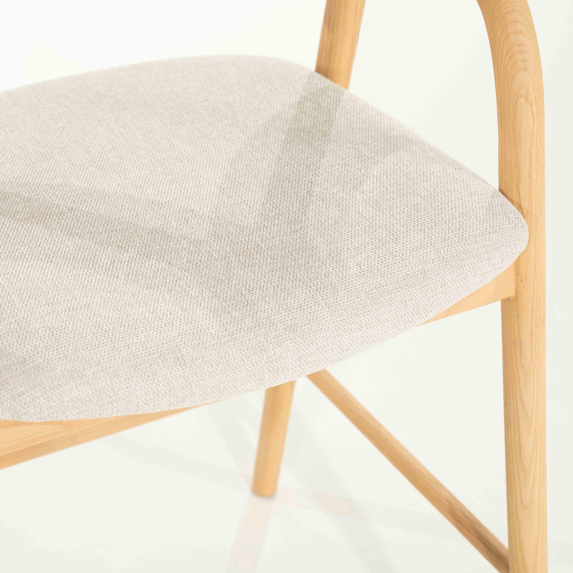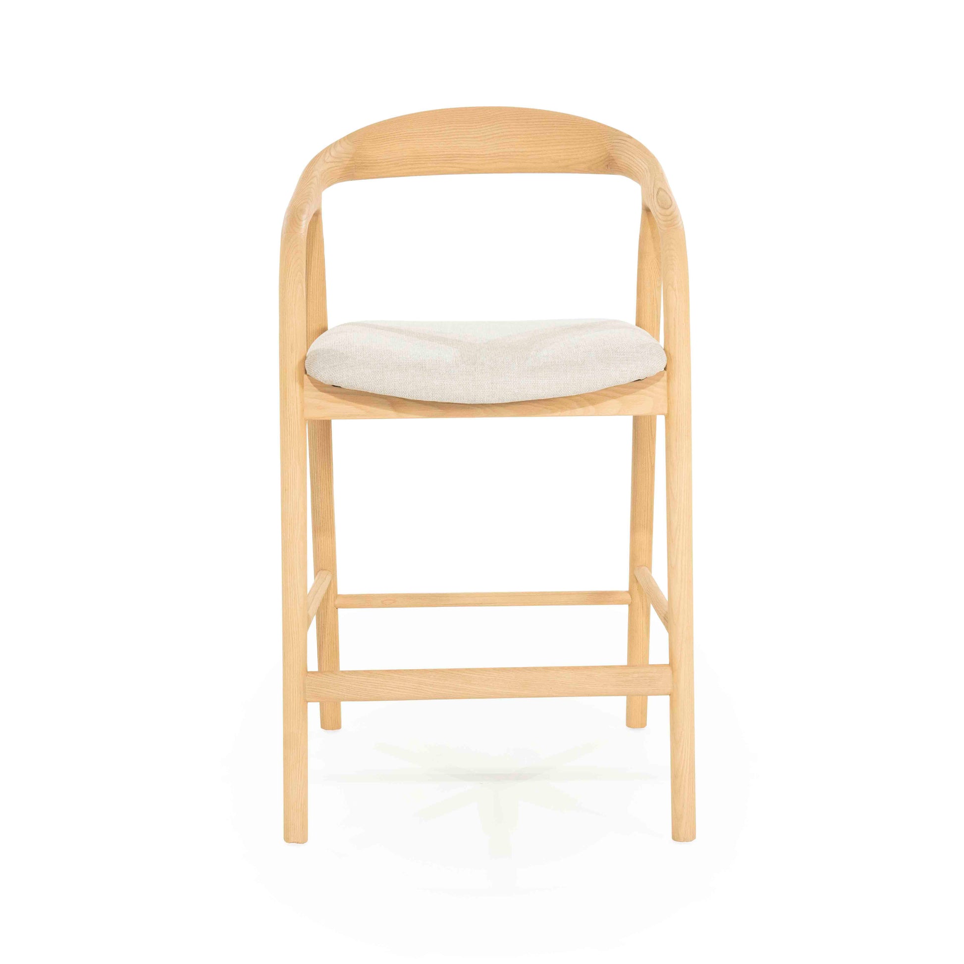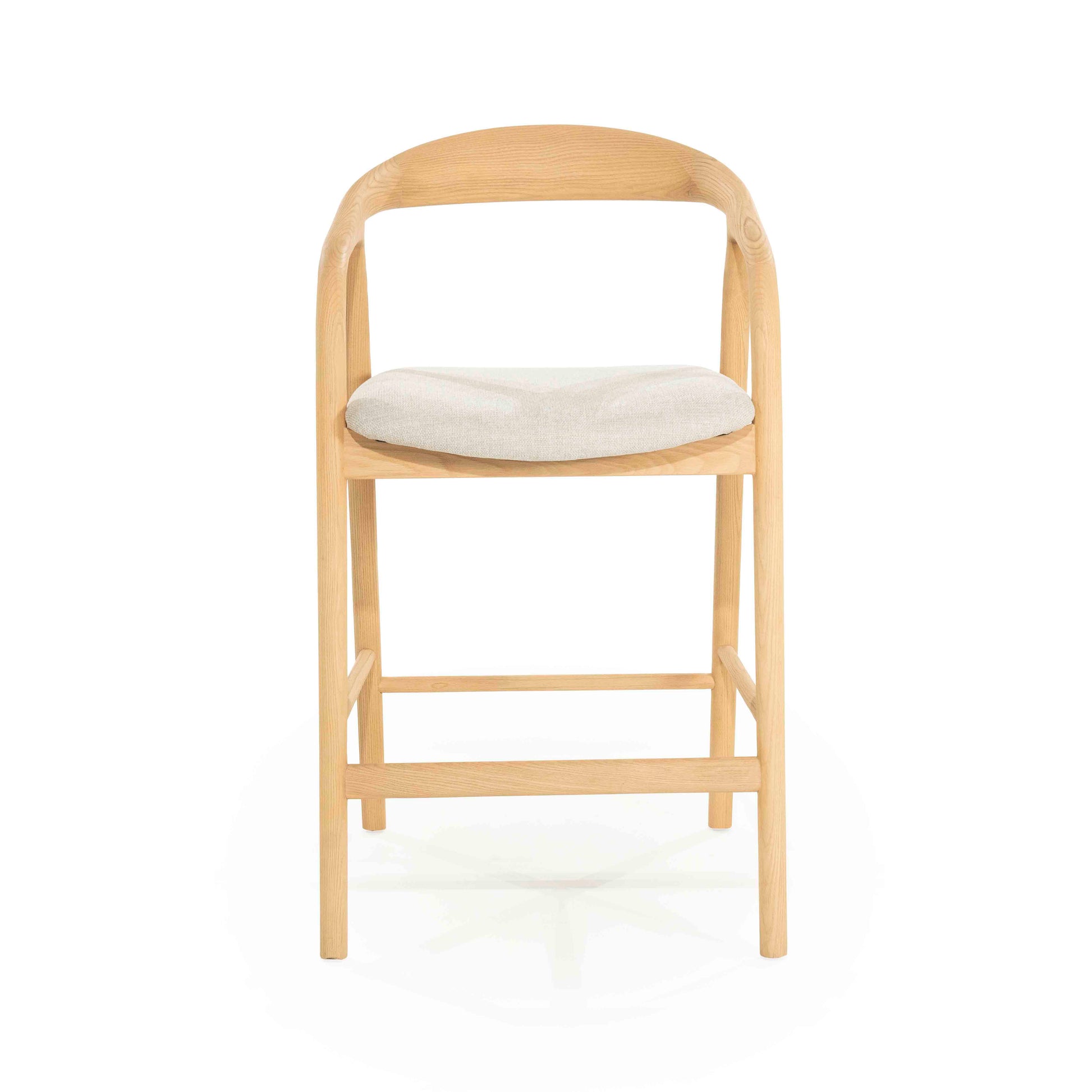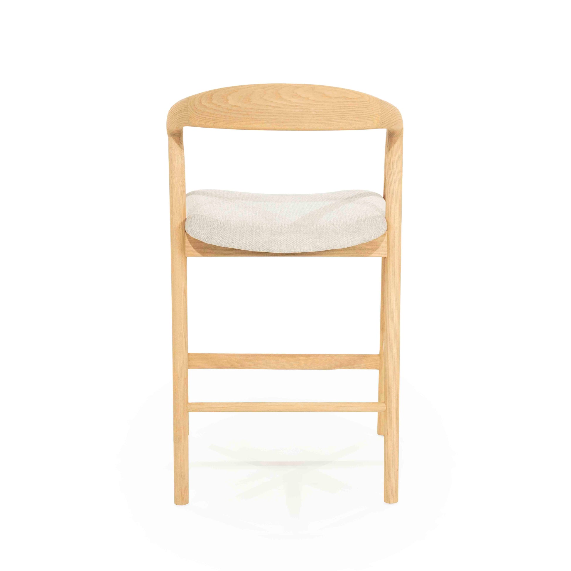 Stilren barstol i lyst treverk med avrundede former og behagelig sete i lyst tekstil. Den buede ryggen gir god støtte, mens den enkle, lette konstruksjonen skaper et moderne og luftig uttrykk. Perfekt til kjøkkenøyen eller barløsningen i stuen.