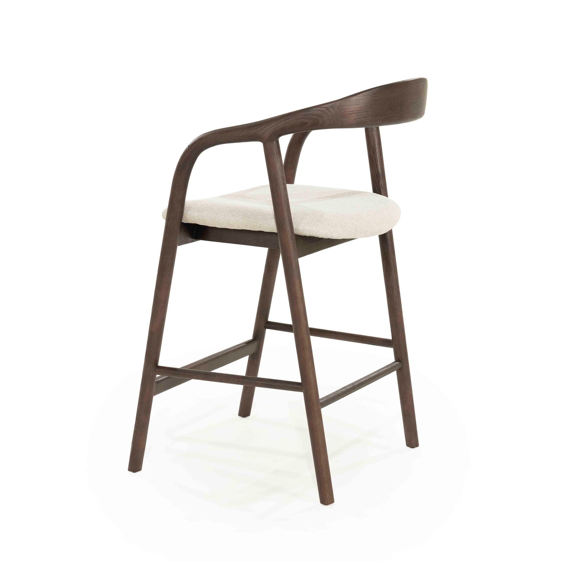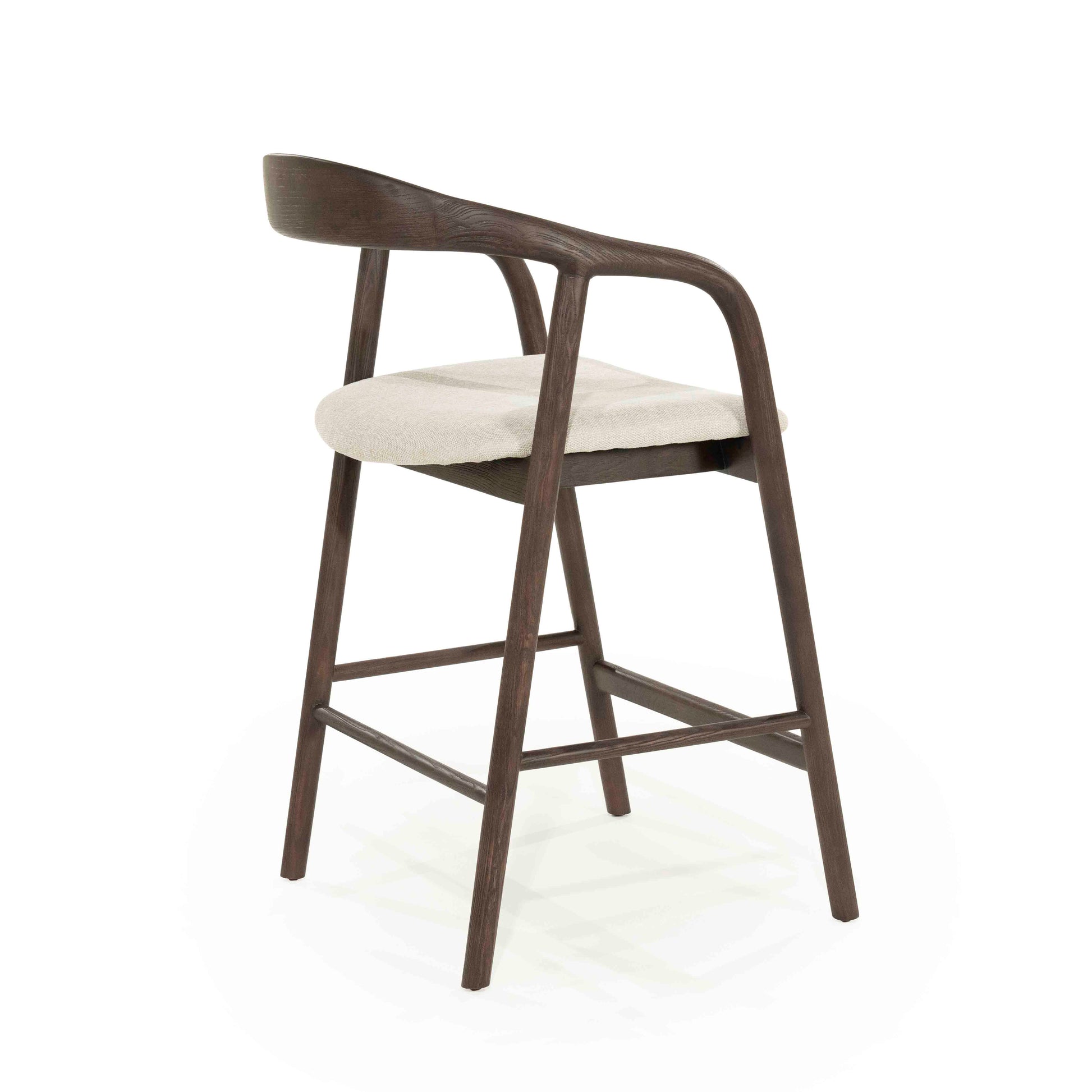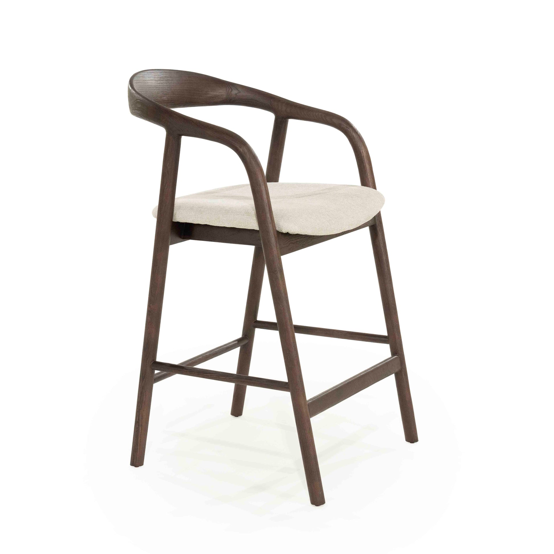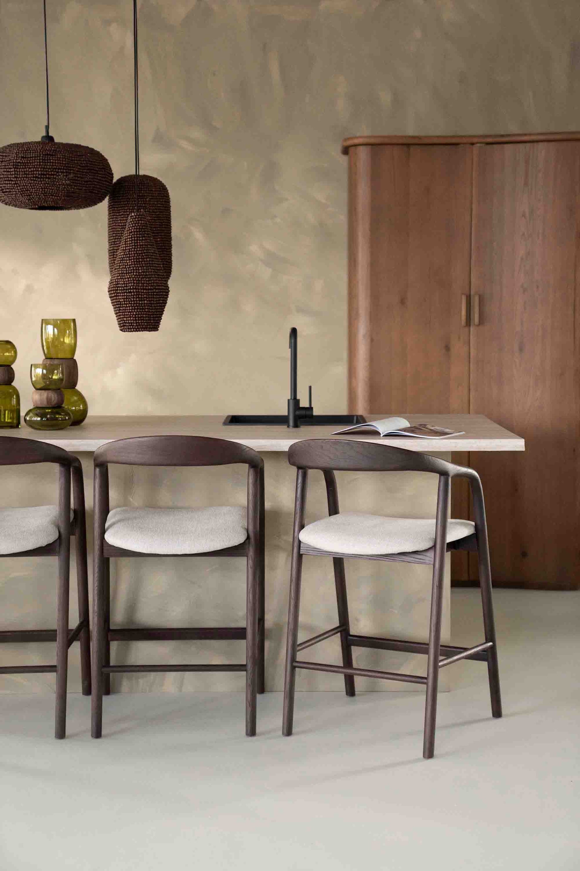 Elegant barstol i mørkbeiset tre med avrundede linjer og et mykt, lyst sete i tekstil. Den harmoniske kontrasten mellom det mørke treverket og det lyse stoffet gir stolen et moderne uttrykk med klassiske referanser. Den buede ryggen sørger for komfort og støtte, mens det lette formspråket passer perfekt inn i både moderne og nordiske interiør.