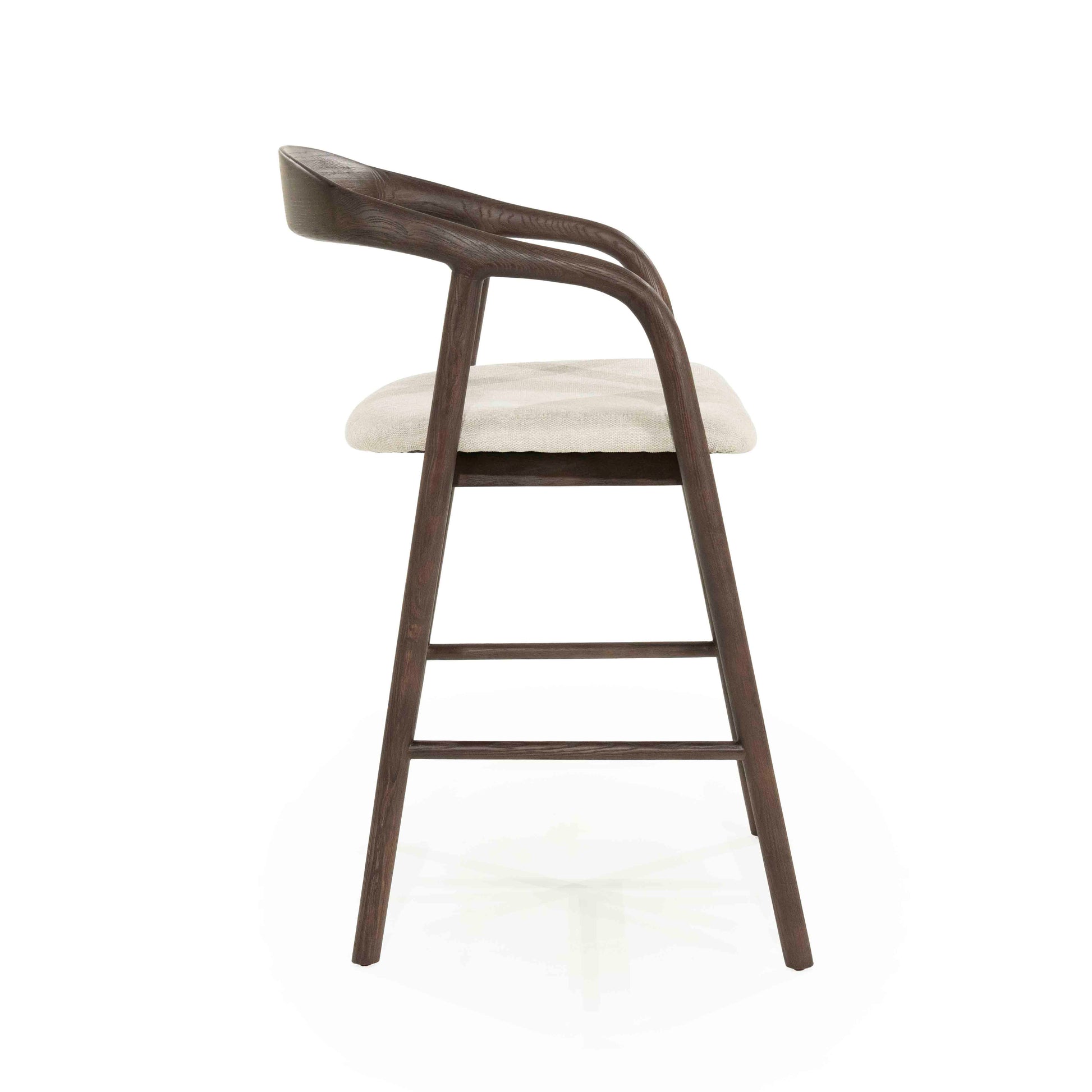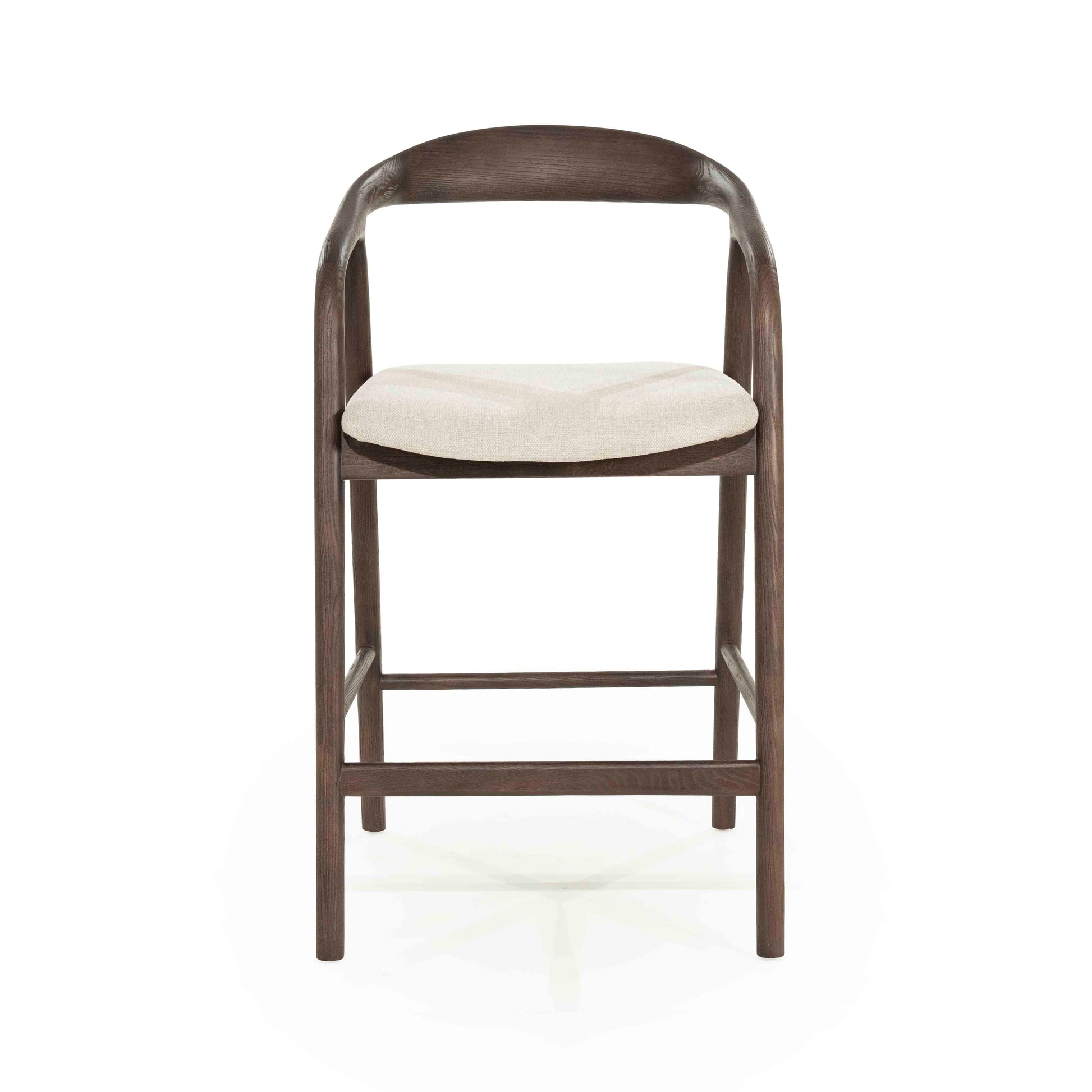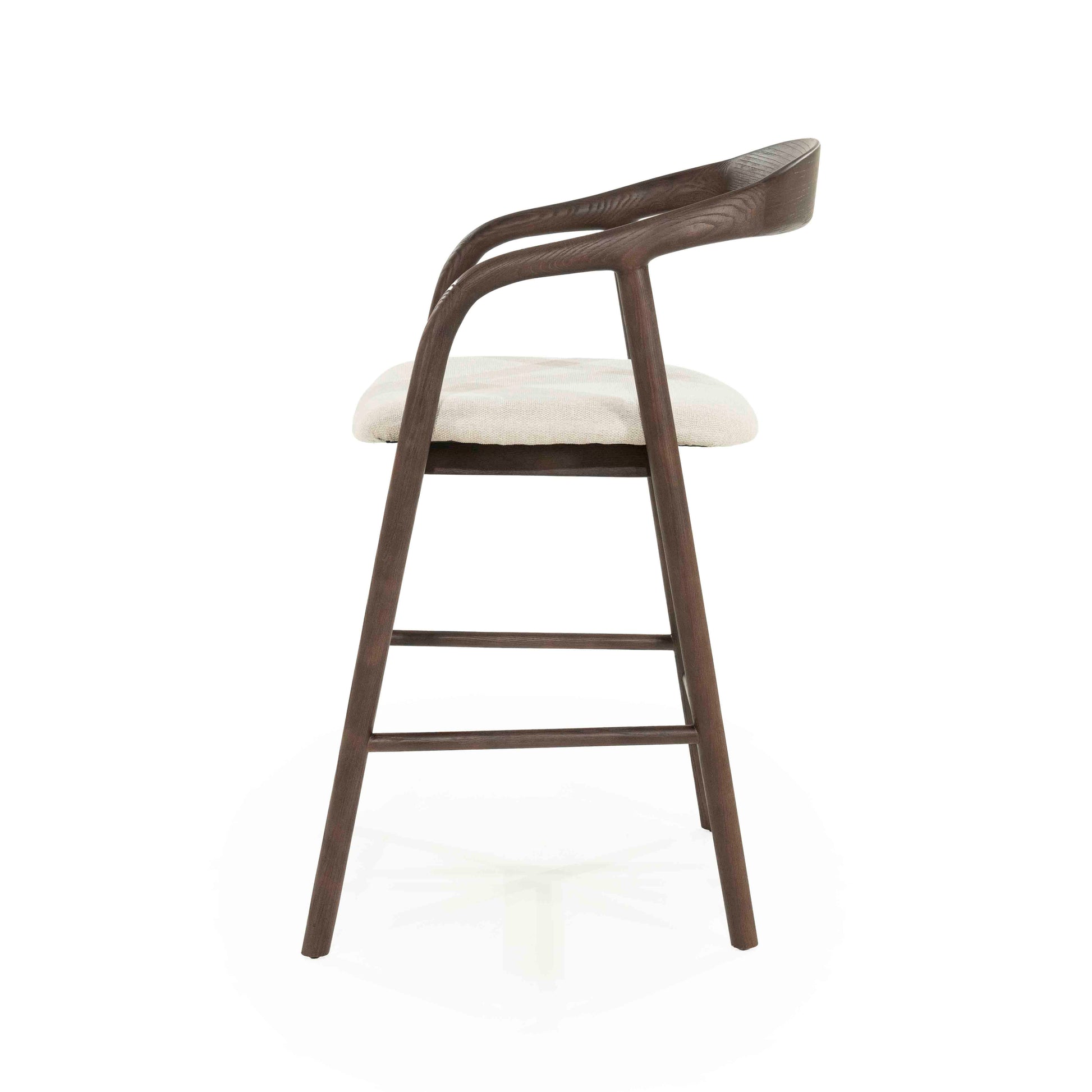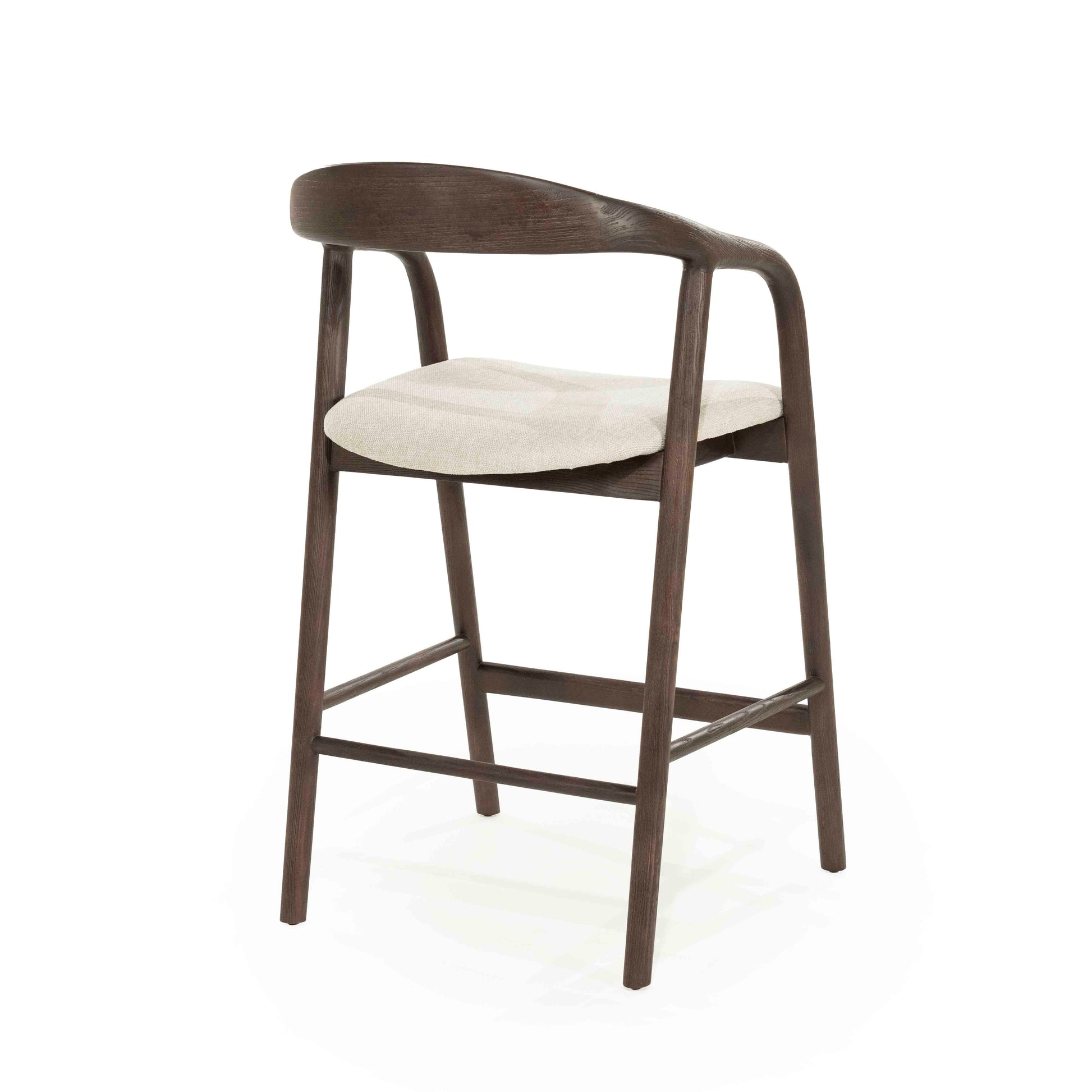 Elegant barstol i mørkbeiset tre med avrundede linjer og et mykt, lyst sete i tekstil. Den harmoniske kontrasten mellom det mørke treverket og det lyse stoffet gir stolen et moderne uttrykk med klassiske referanser. Den buede ryggen sørger for komfort og støtte, mens det lette formspråket passer perfekt inn i både moderne og nordiske interiør.