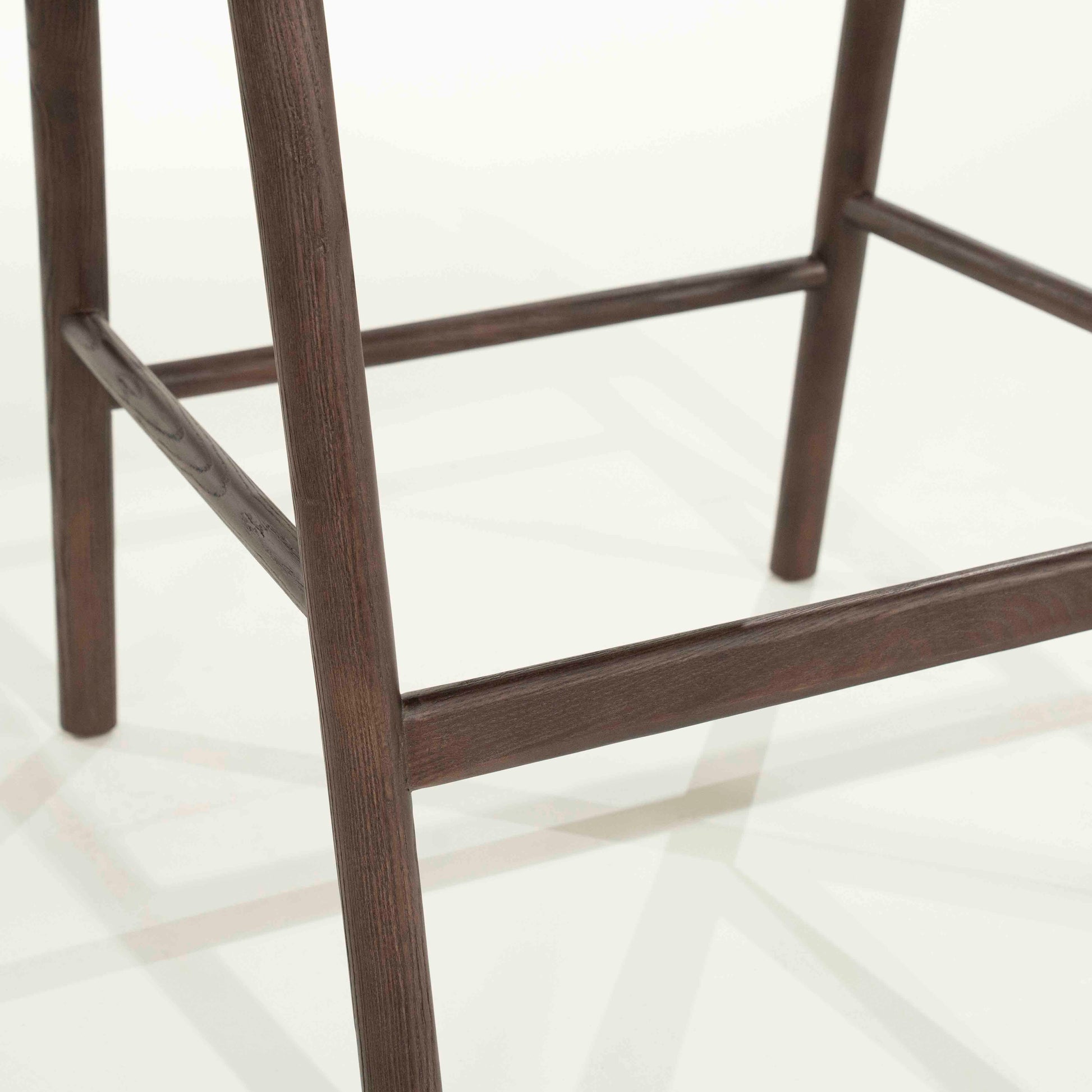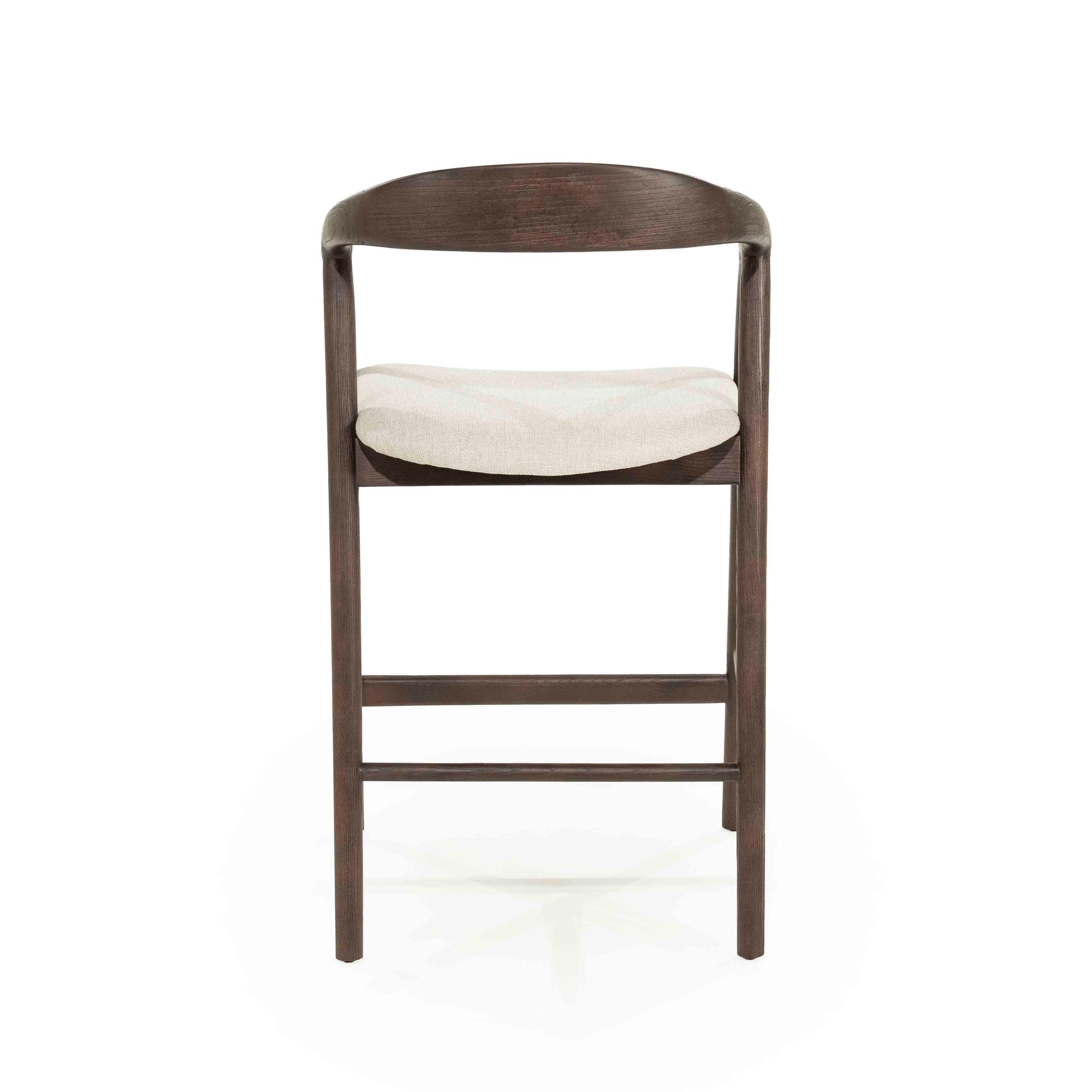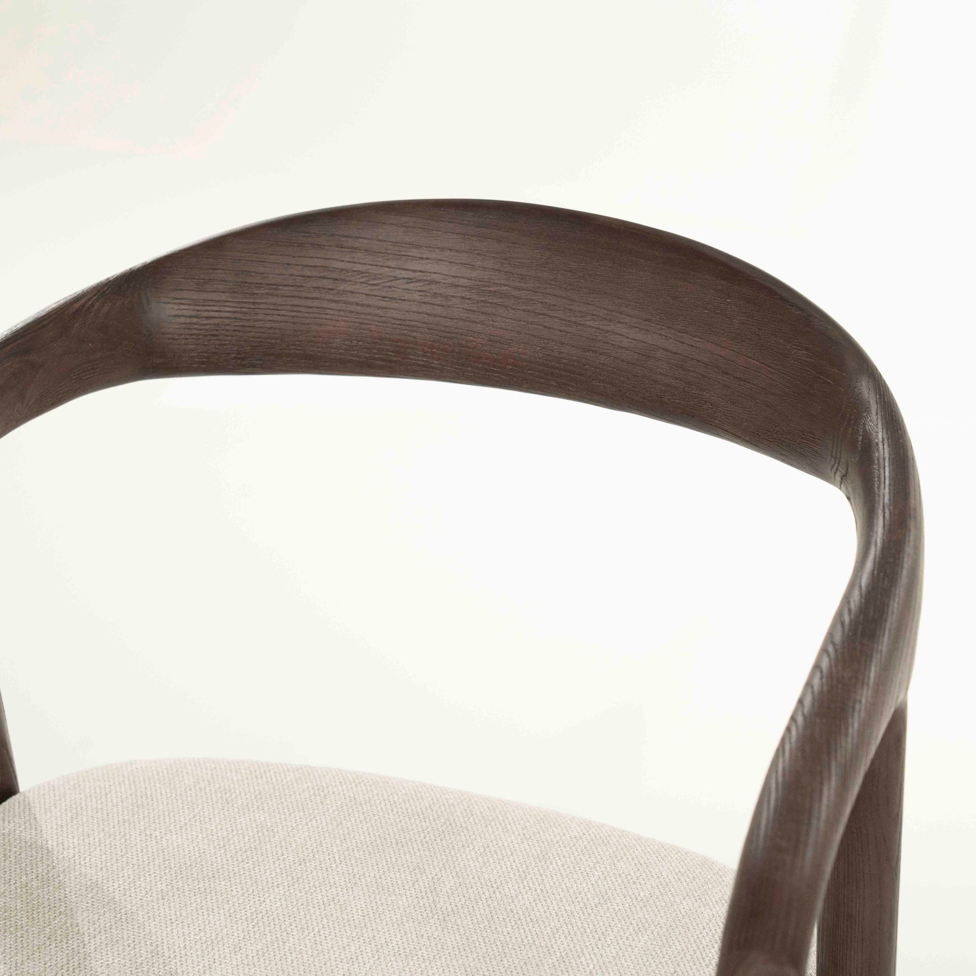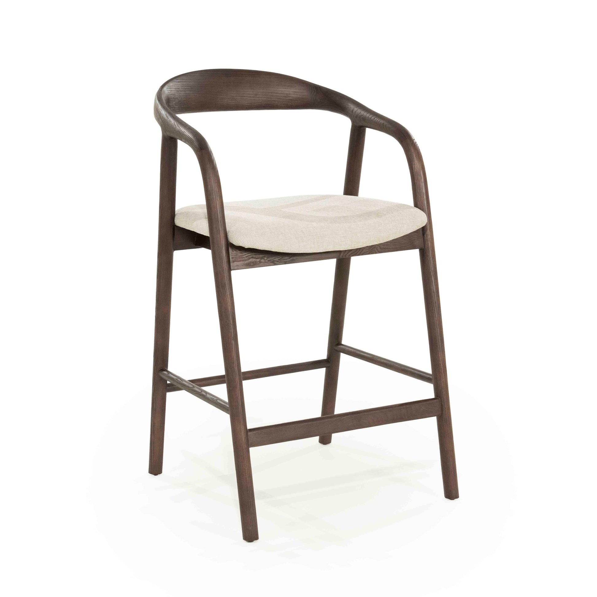 Elegant barstol i mørkbeiset tre med avrundede linjer og et mykt, lyst sete i tekstil. Den harmoniske kontrasten mellom det mørke treverket og det lyse stoffet gir stolen et moderne uttrykk med klassiske referanser. Den buede ryggen sørger for komfort og støtte, mens det lette formspråket passer perfekt inn i både moderne og nordiske interiør.