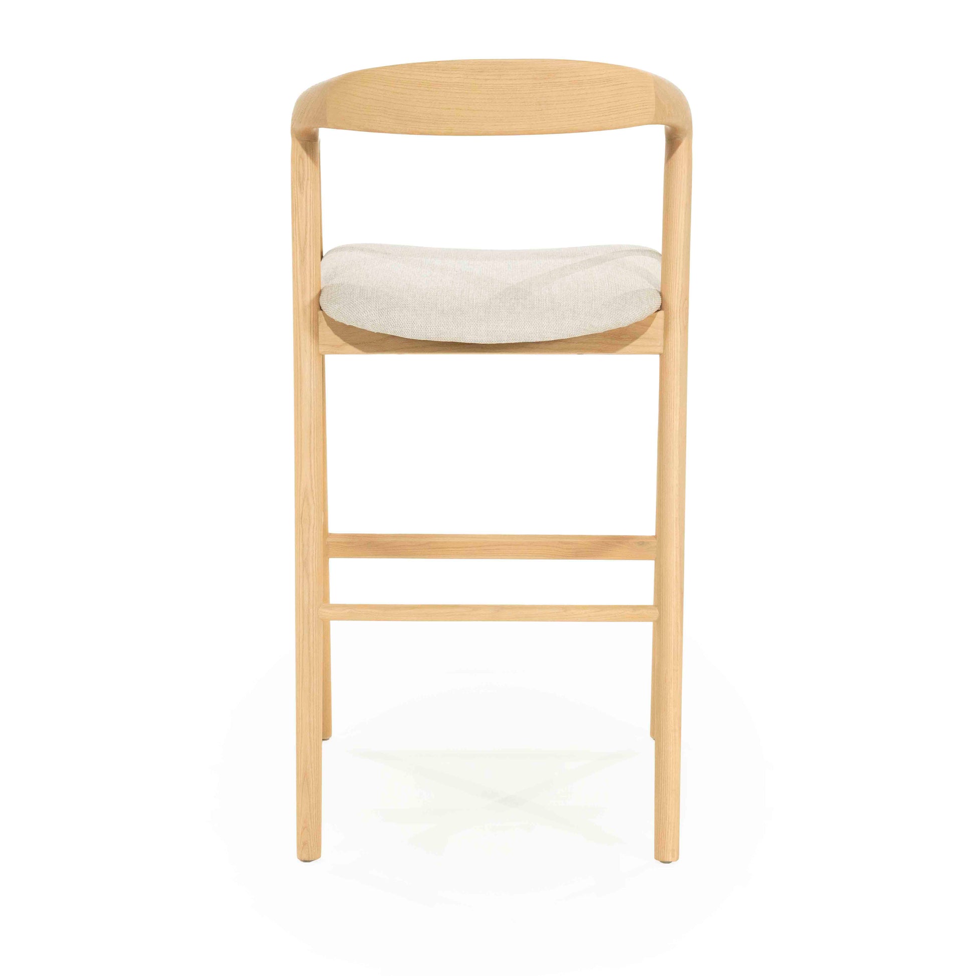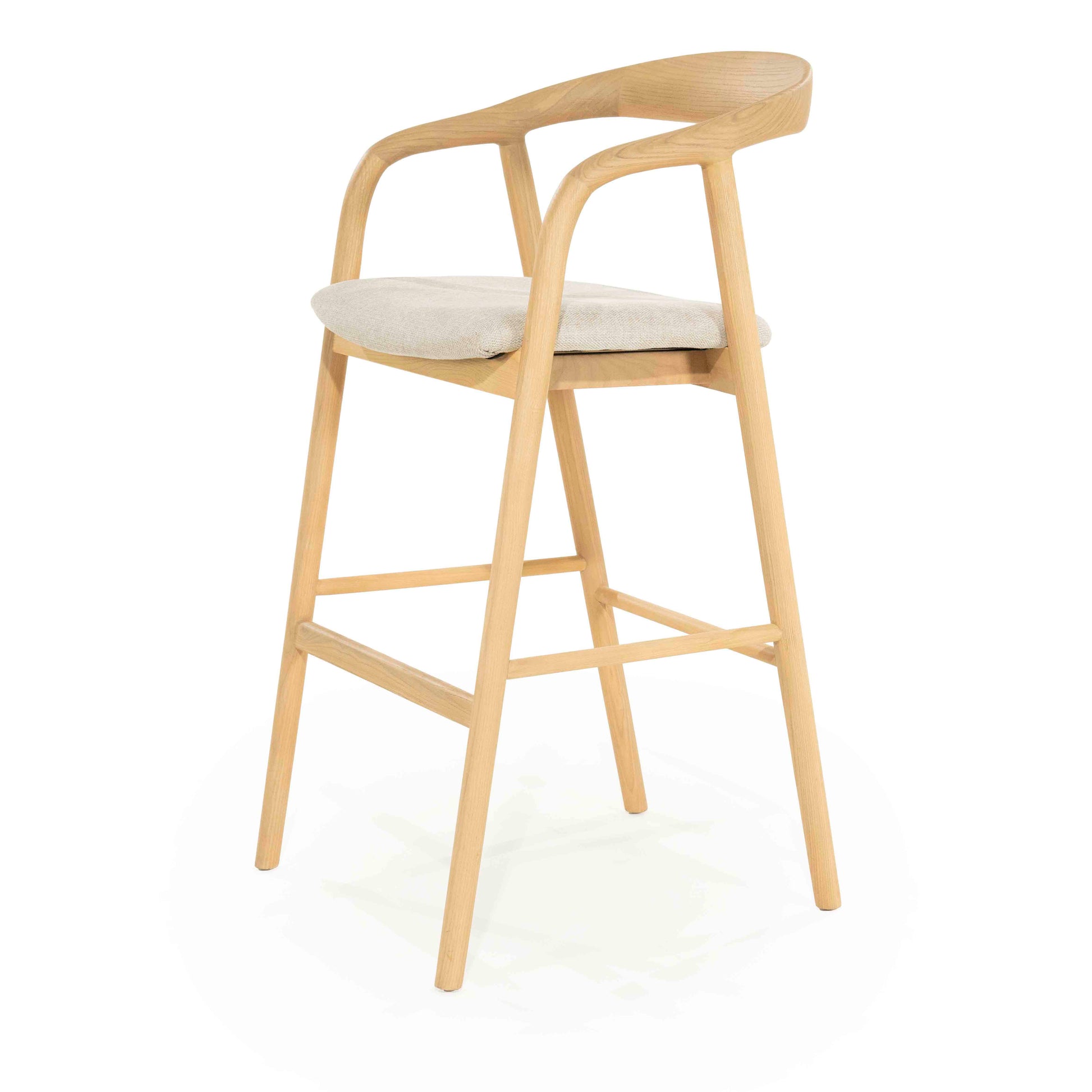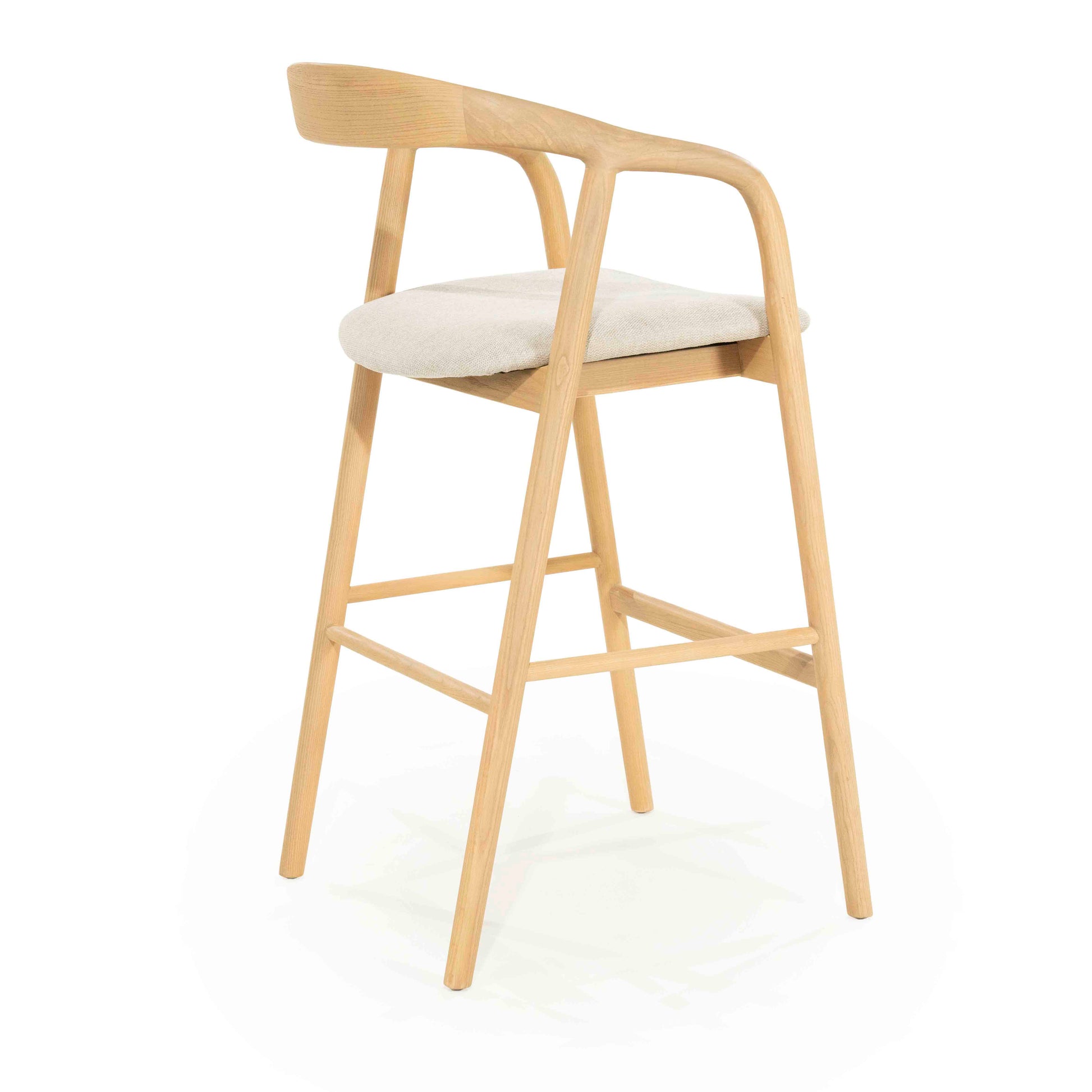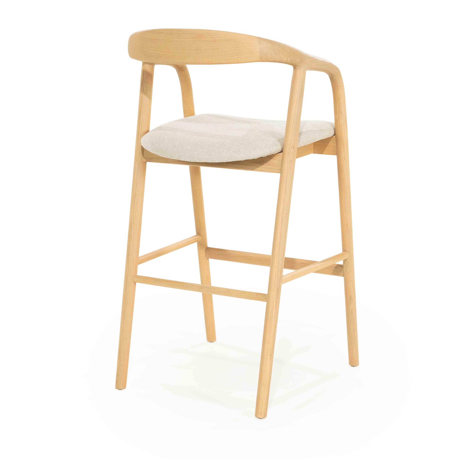Stilren barstol i lyst treverk med avrundede former og behagelig sete i lyst tekstil. Den buede ryggen gir god støtte, mens den enkle, lette konstruksjonen skaper et moderne og luftig uttrykk. Perfekt til kjøkkenøyen eller barløsningen i stuen.