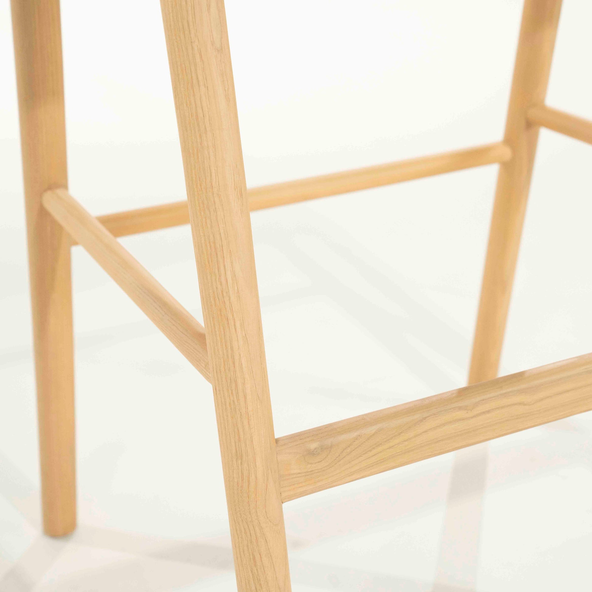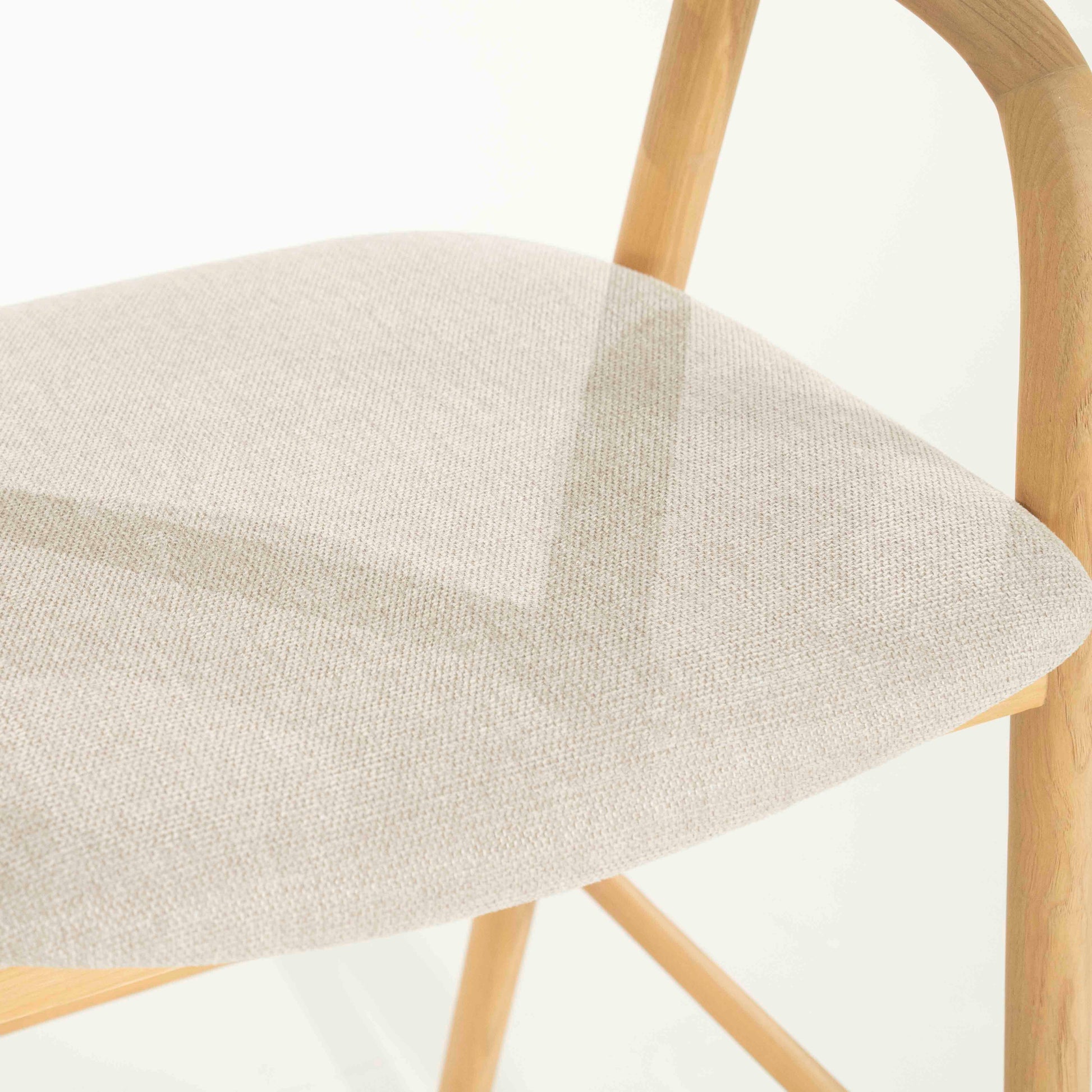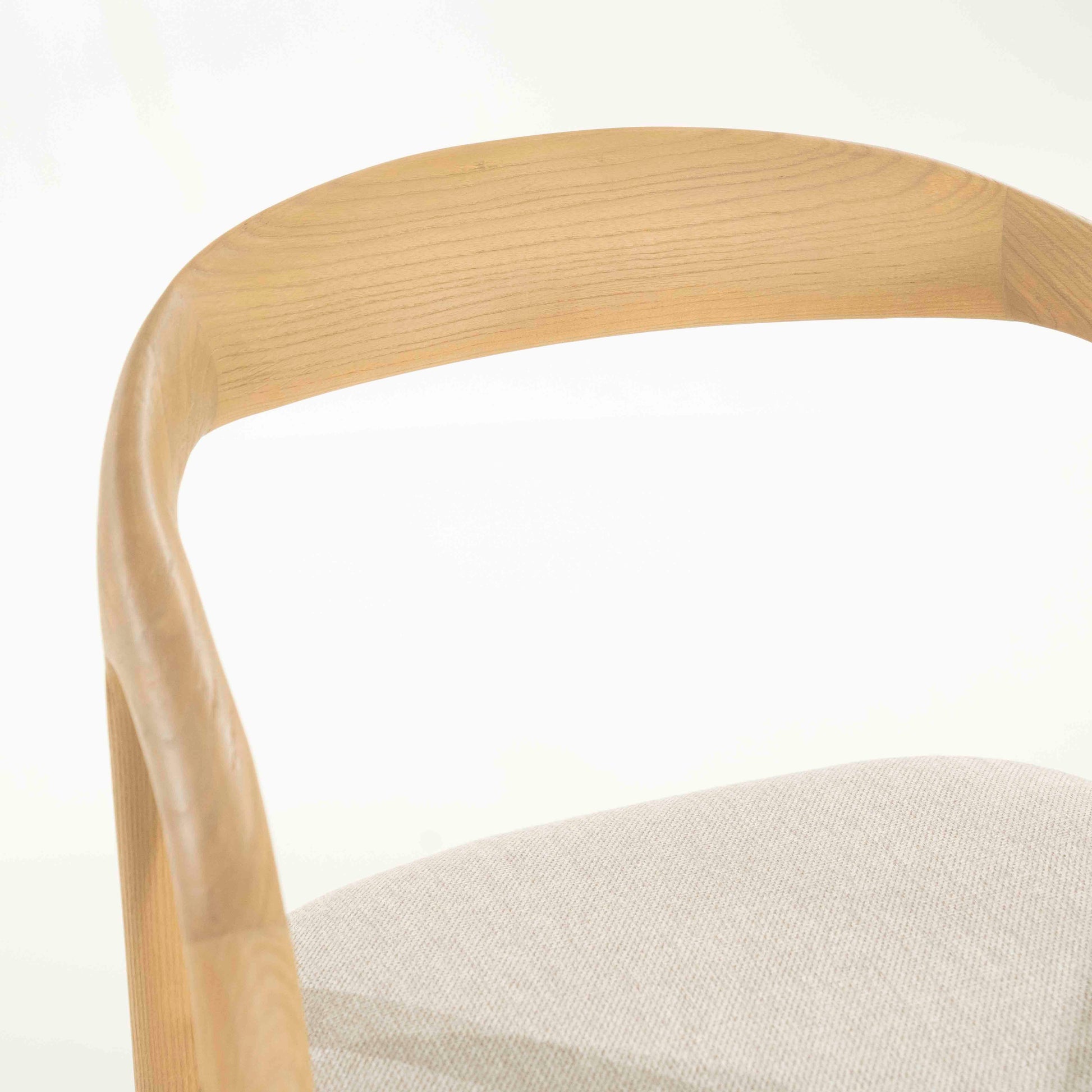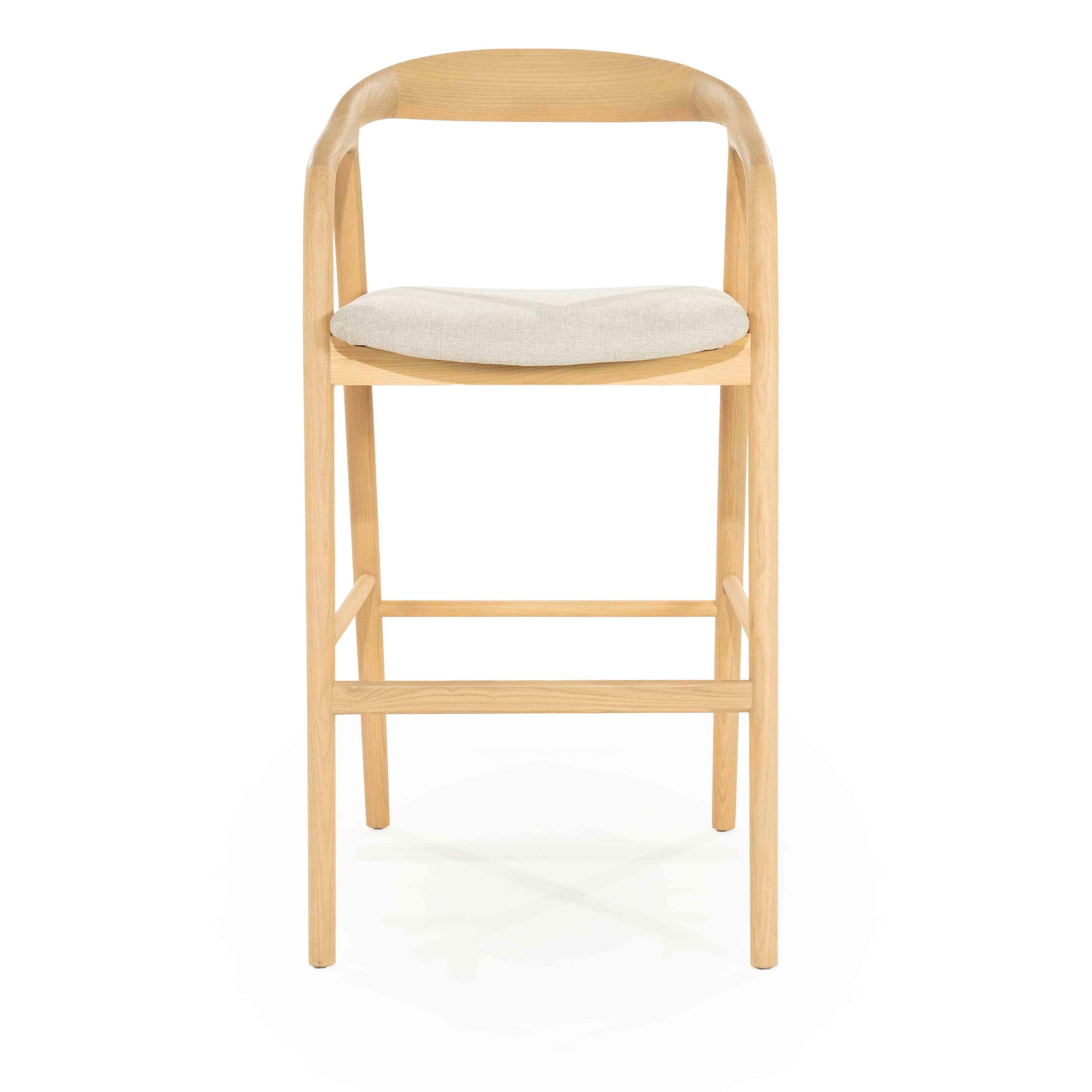 Stilren barstol i lyst treverk med avrundede former og behagelig sete i lyst tekstil. Den buede ryggen gir god støtte, mens den enkle, lette konstruksjonen skaper et moderne og luftig uttrykk. Perfekt til kjøkkenøyen eller barløsningen i stuen.