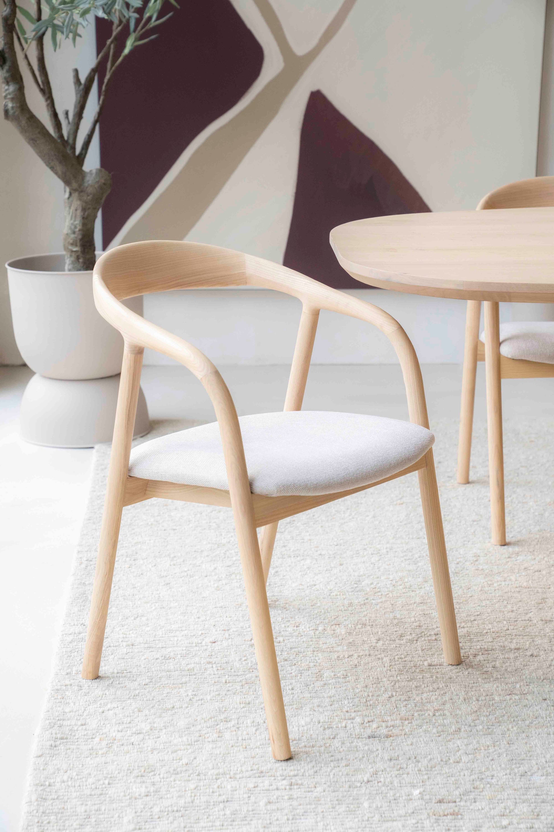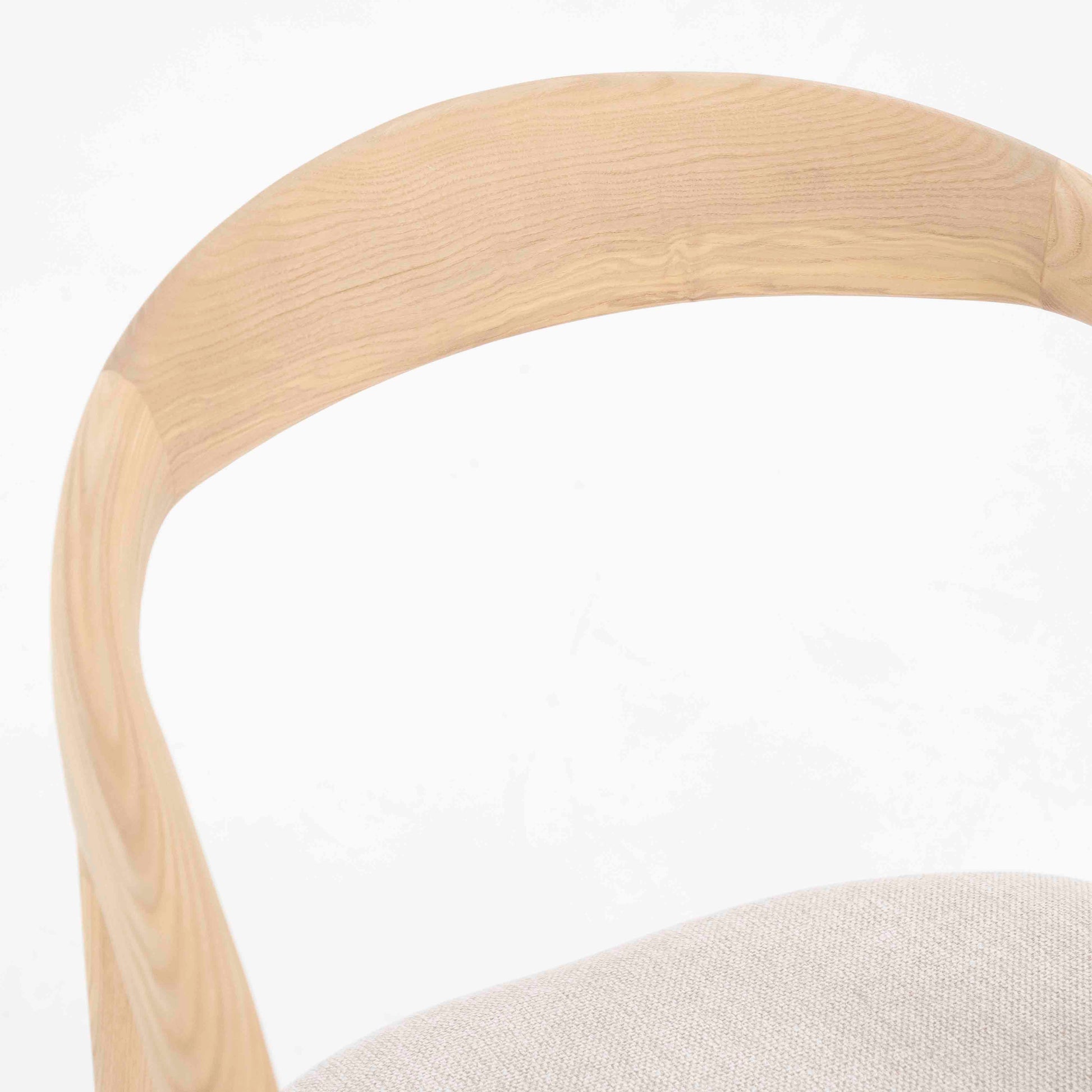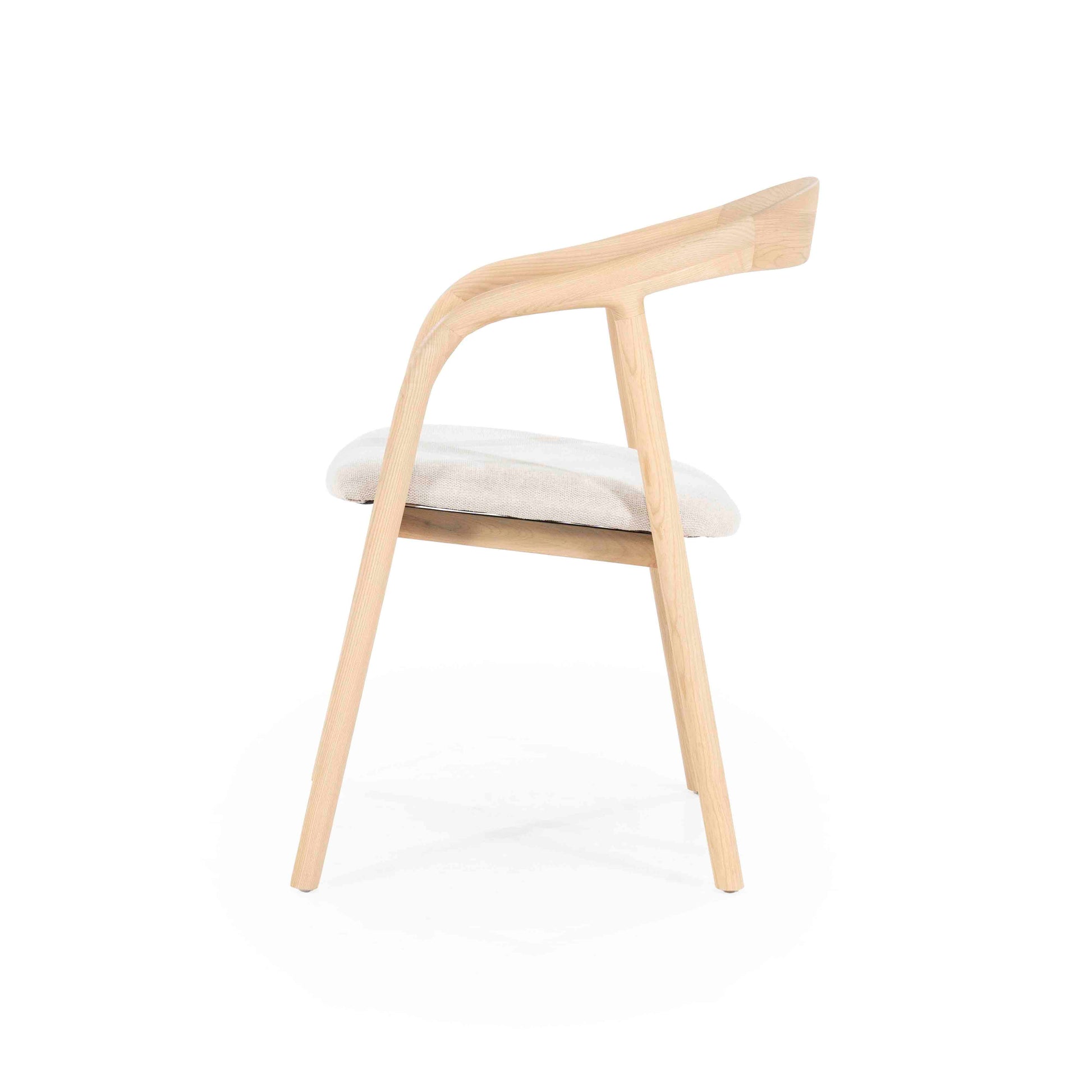 En elegant spisestol som kombinerer skandinavisk minimalisme med naturlige materialer. Den buede rammen i lys ask gir stolen et lett og organisk uttrykk, mens det polstrede setet i lyst stoff sørger for komfort ved bordet. En tidløs stol som passer like godt i moderne som klassiske interiør.