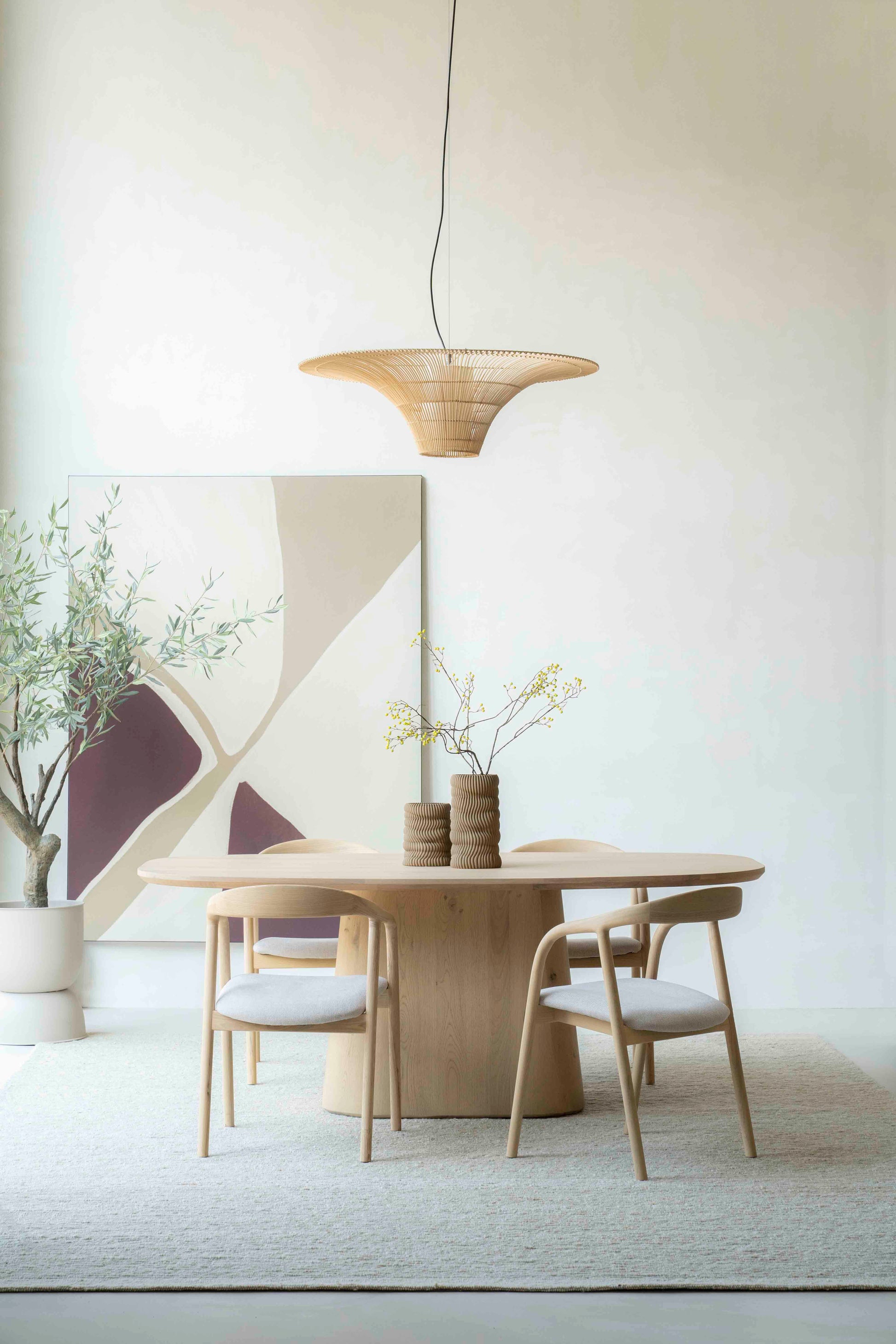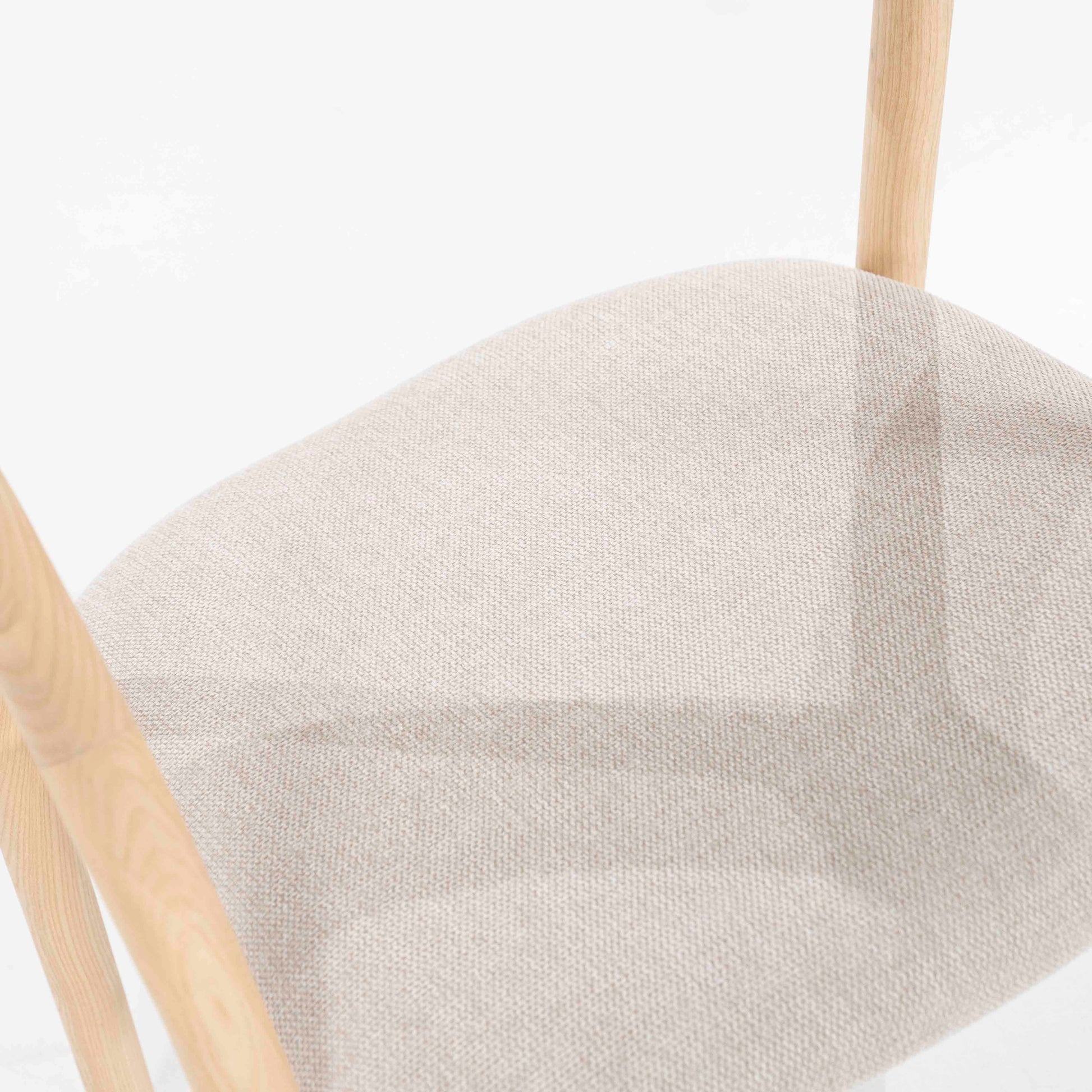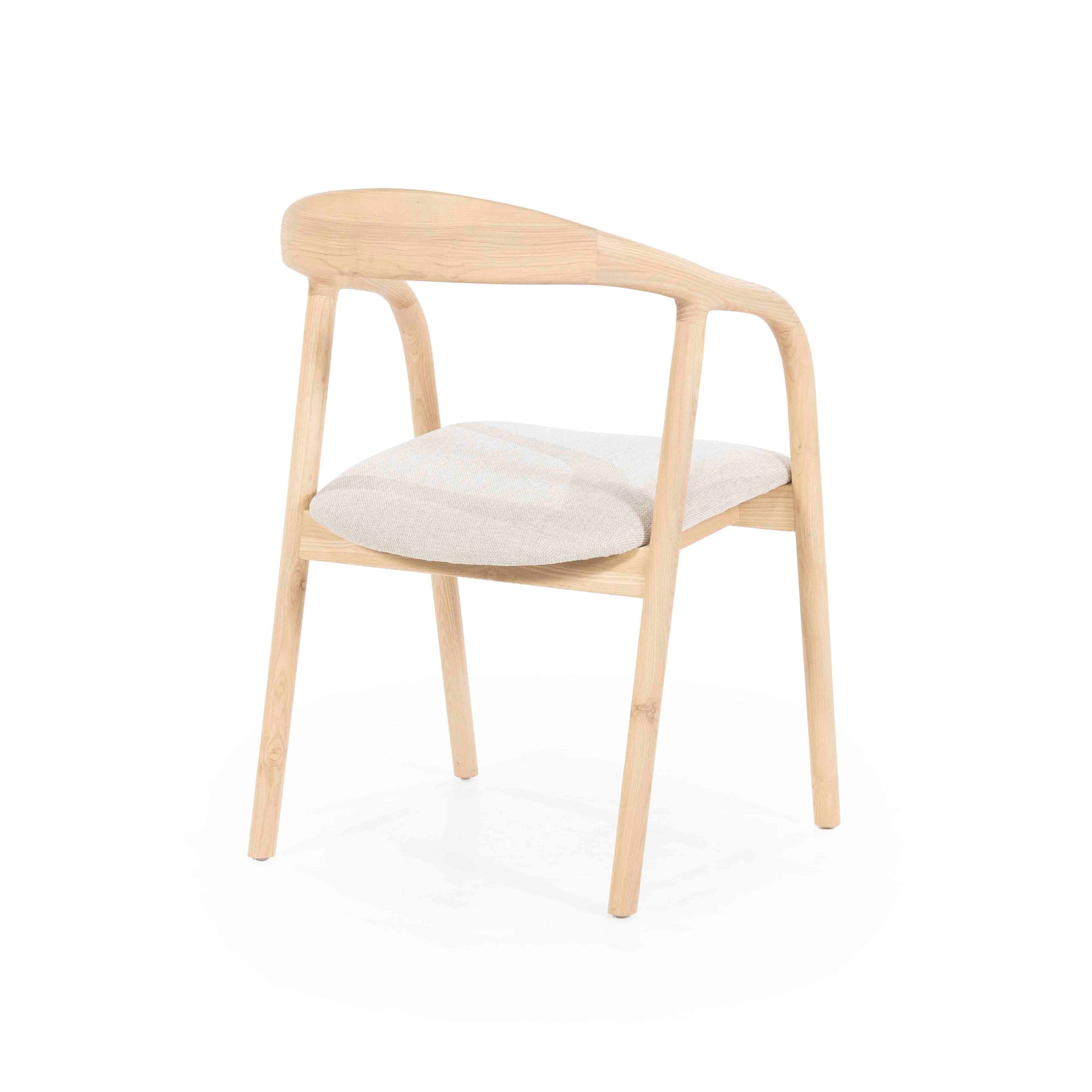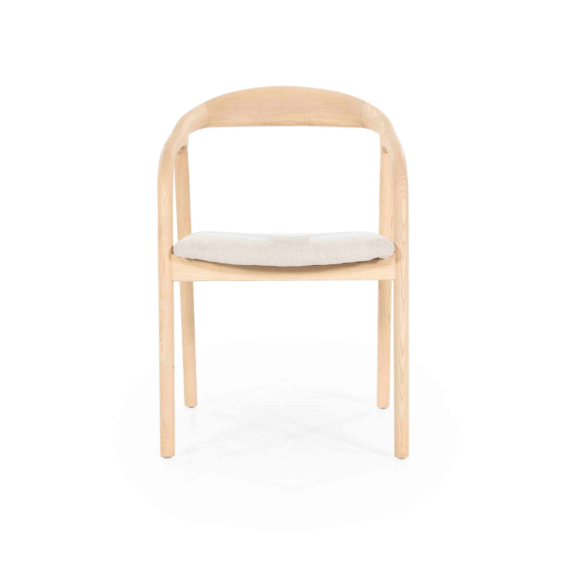 En elegant spisestol som kombinerer skandinavisk minimalisme med naturlige materialer. Den buede rammen i lys ask gir stolen et lett og organisk uttrykk, mens det polstrede setet i lyst stoff sørger for komfort ved bordet. En tidløs stol som passer like godt i moderne som klassiske interiør.