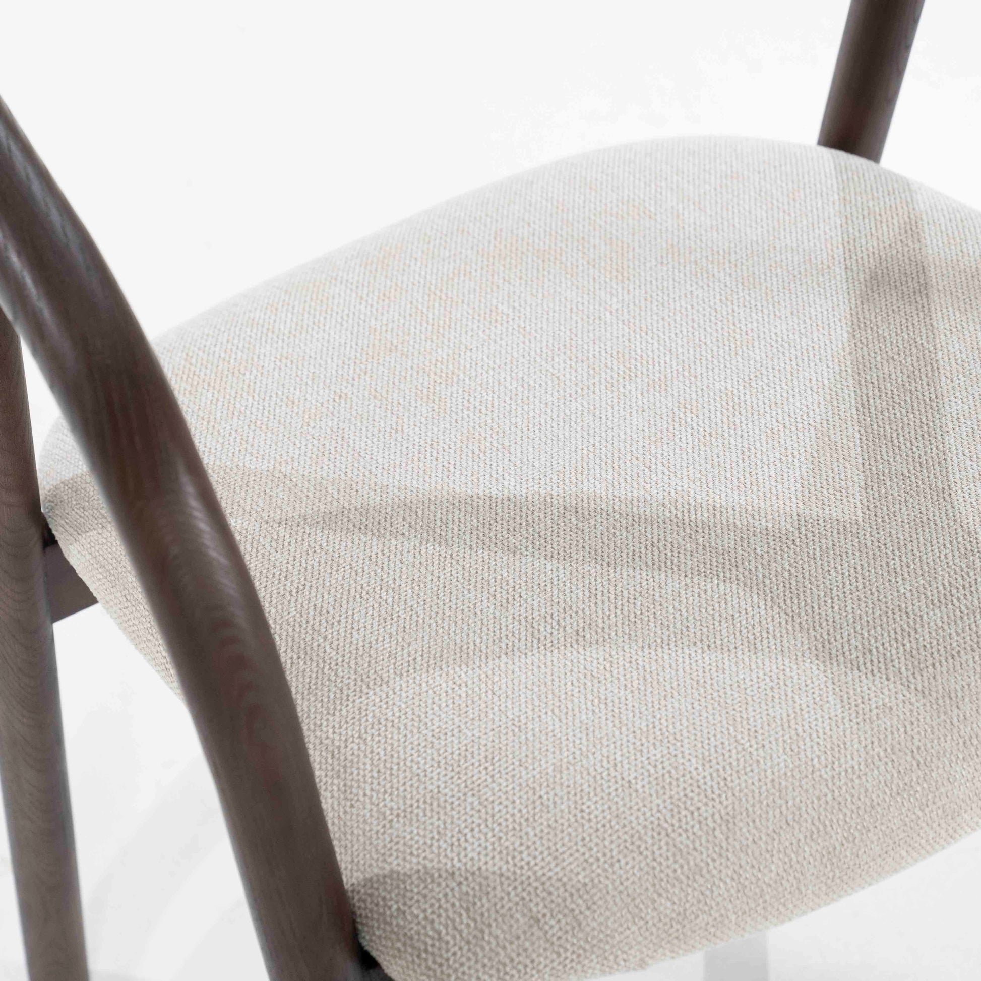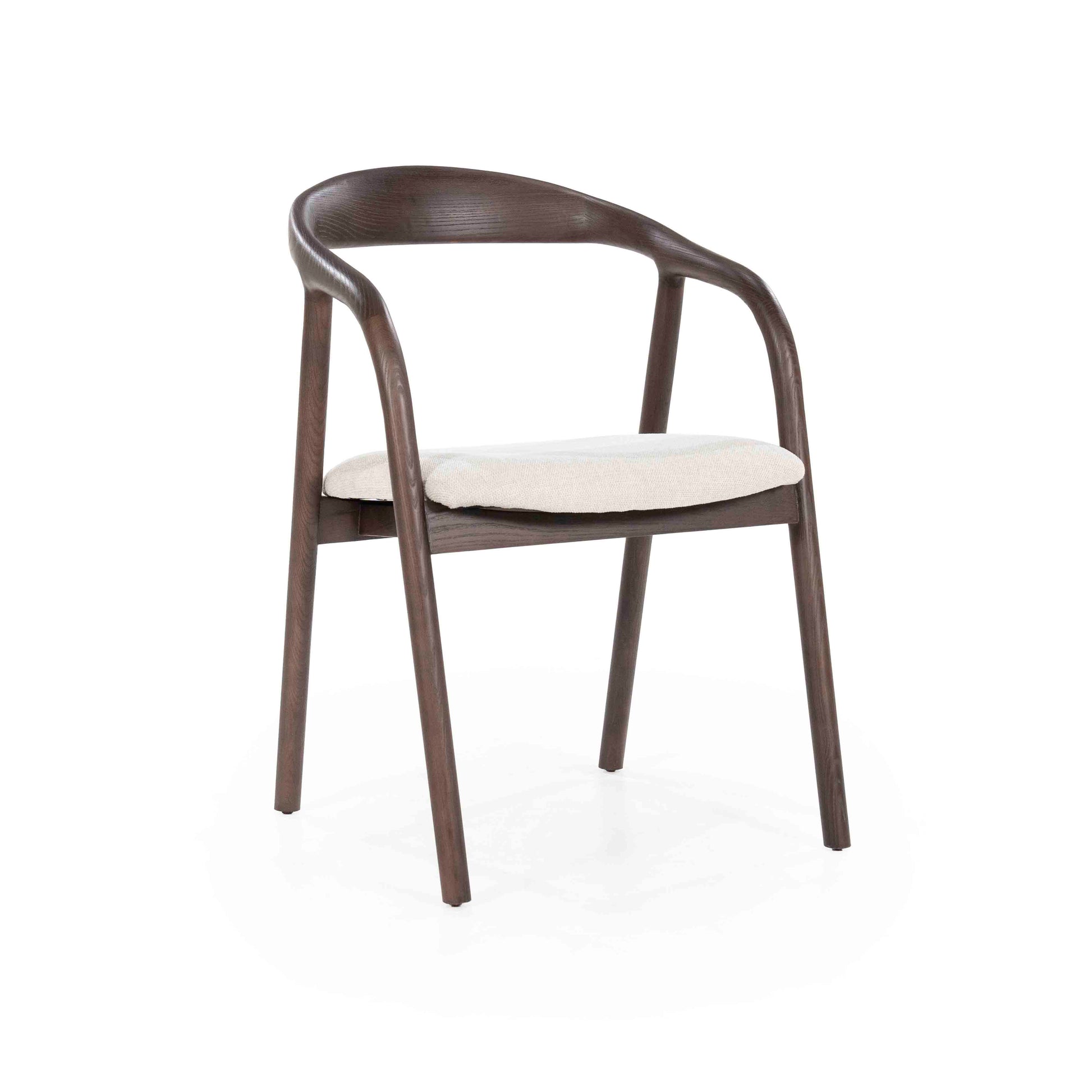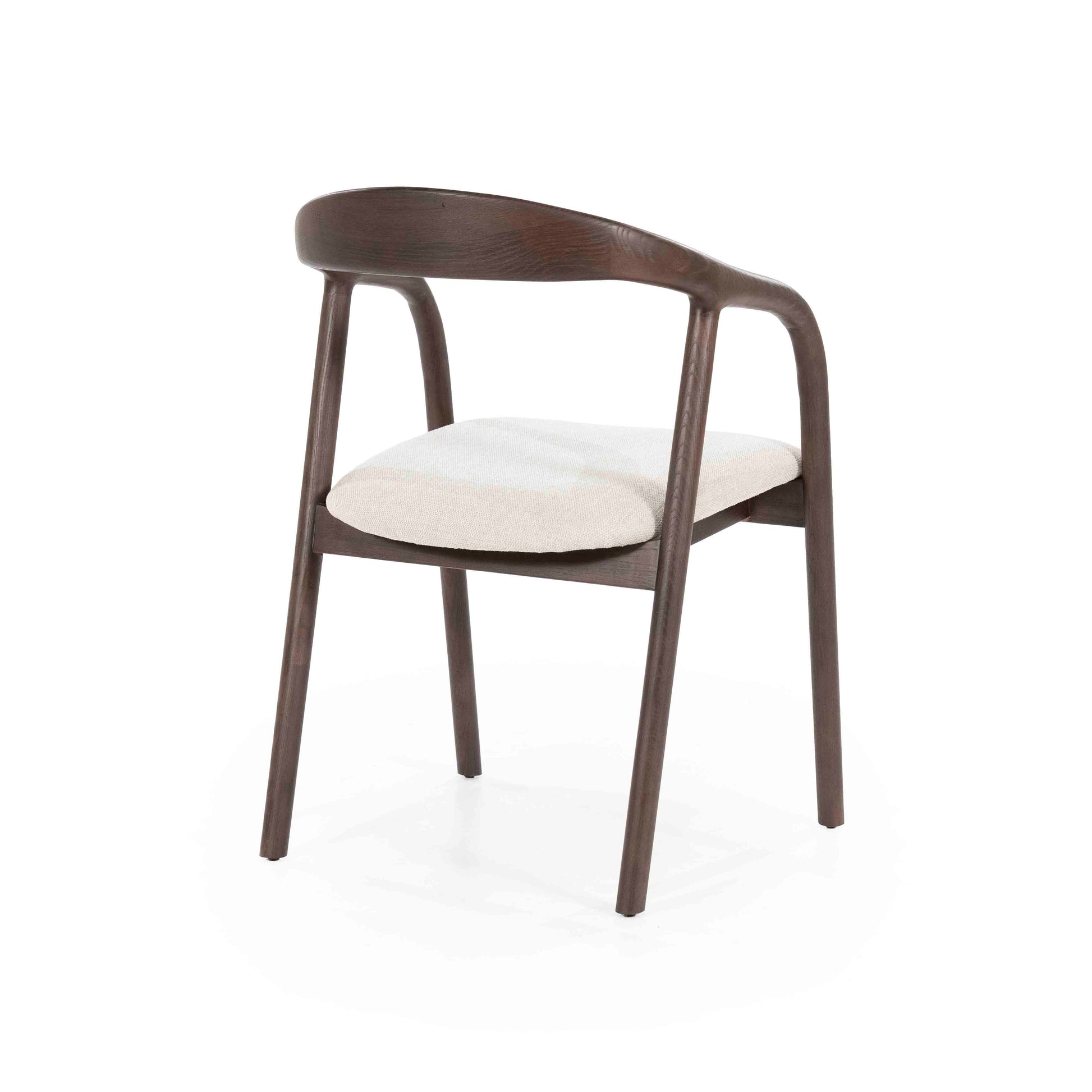 En elegant spisestol som kombinerer skandinavisk minimalisme med naturlige materialer. Den buede rammen i mørk ask gir stolen et lett og organisk uttrykk, mens det polstrede setet i lyst stoff sørger for komfort ved bordet. En tidløs stol som passer like godt i moderne som klassiske interiør.