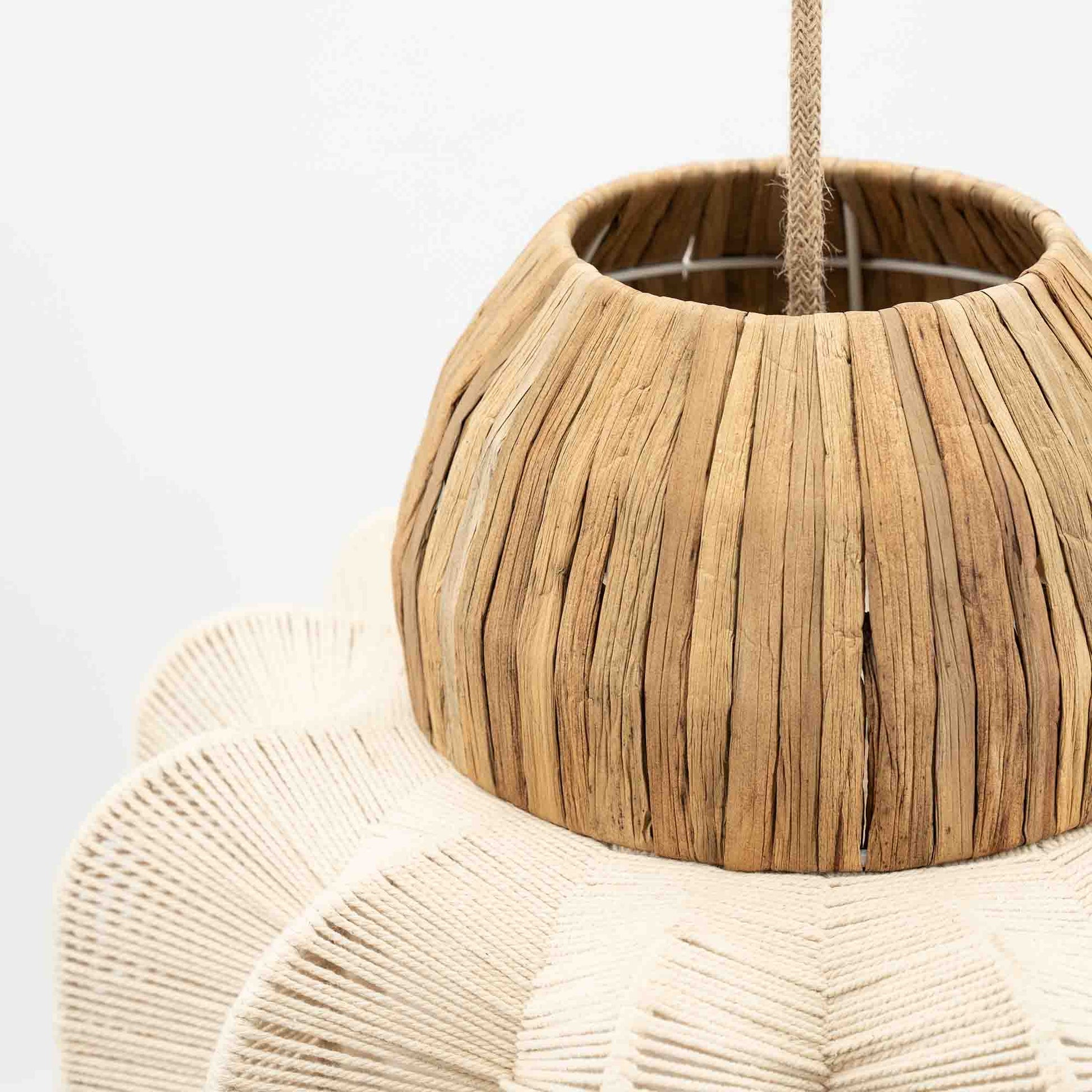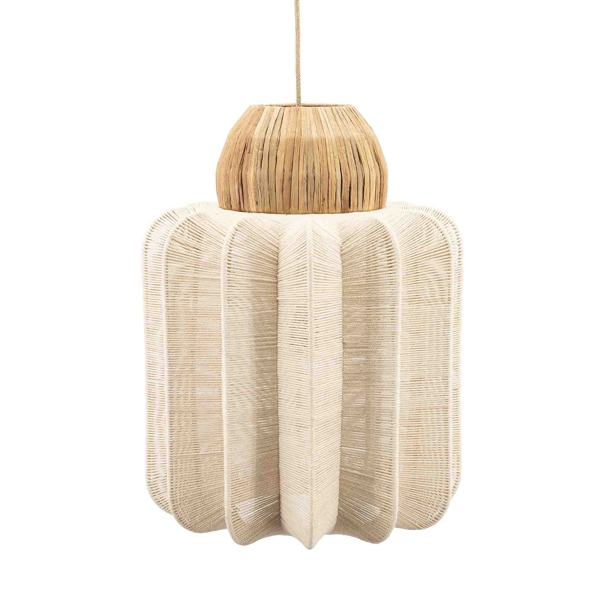 Denne vakre pendellampen kombinerer naturlige materialer med et moderne, skulpturelt uttrykk. Lampen er håndvevd i bomull, sjøgress og sisal, som gir den et mykt, organisk preg og en flott tekstur som skaper spill i lyset. Den elegante formen og de luftige strukturene gjør lampen til et unikt blikkfang – perfekt over spisebordet, i stuen eller i en koselig krok.