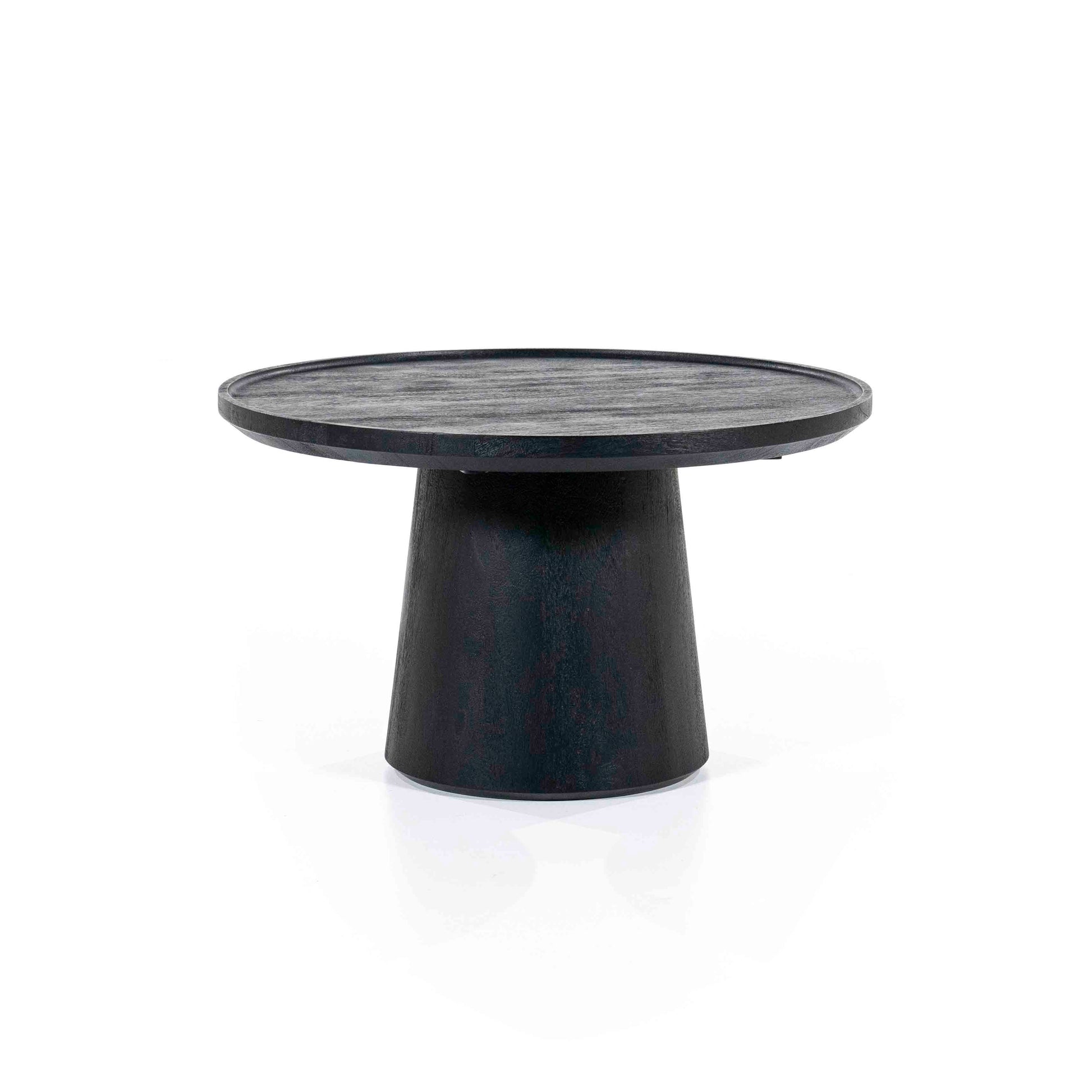 Et lavt salongbord laget av massivt sort tre, med en avrundet, kvadratisk bordplate og en robust, konisk base. Bordets form gir det et skulpturelt preg som tilfører både tyngde og eleganse til rommet. Det mørke treverket gir en varm og eksklusiv følelse, perfekt for moderne og naturlige interiører.