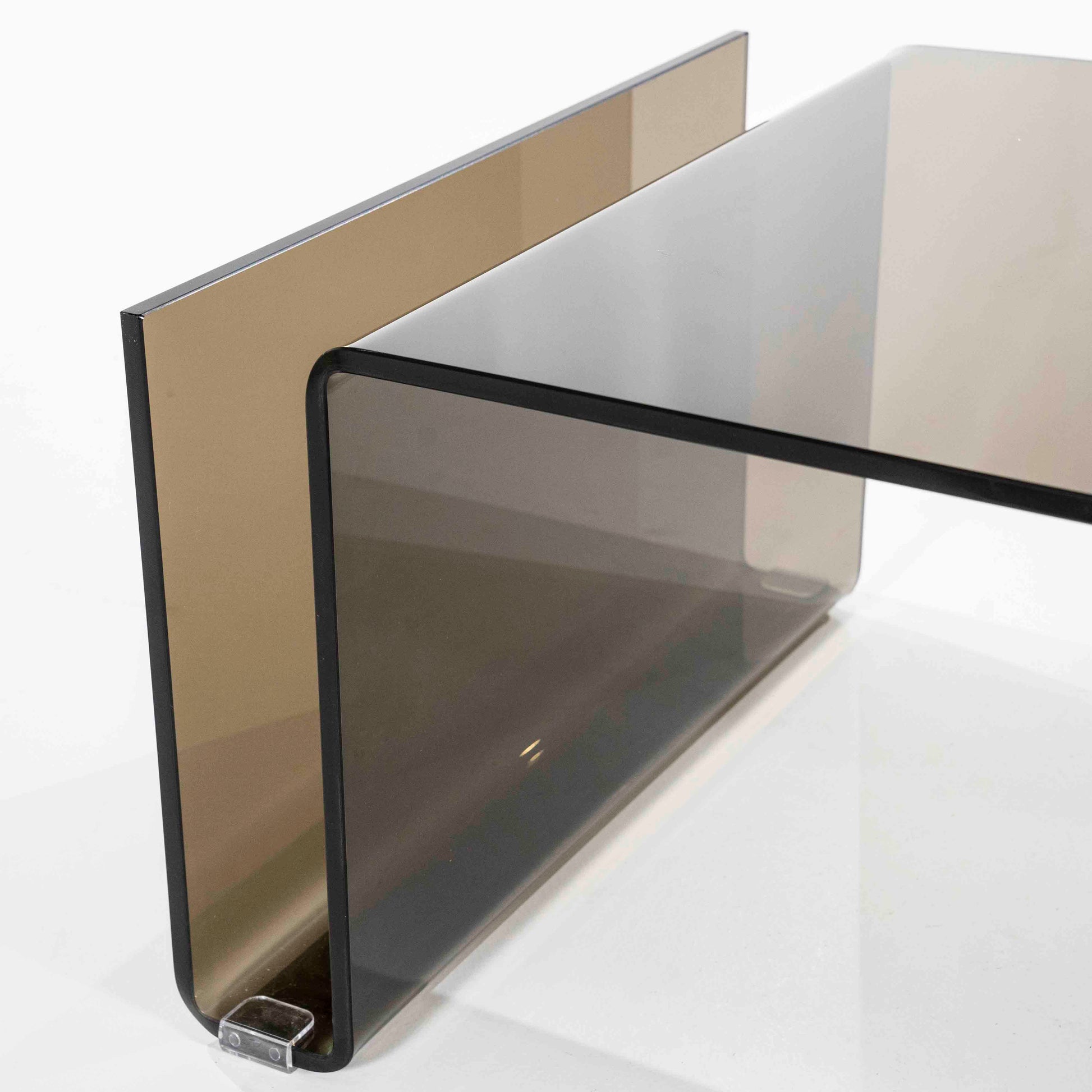 Et elegant og moderne sidebord laget av buet sotet glass. Den helhetlige glasskonstruksjonen gir et rent og luftig uttrykk, mens den mørke tonen tilfører dybde og eksklusivitet. Bordet passer perfekt som et sidebord i stuen, ved sofaen eller som nattbord i et stilrent soverom.