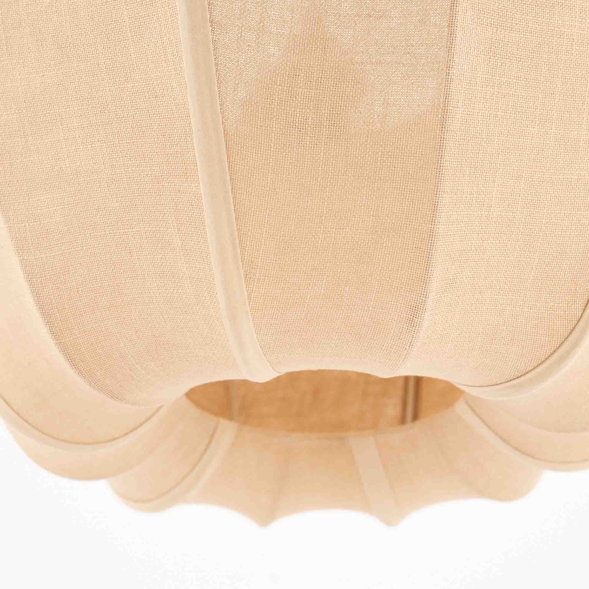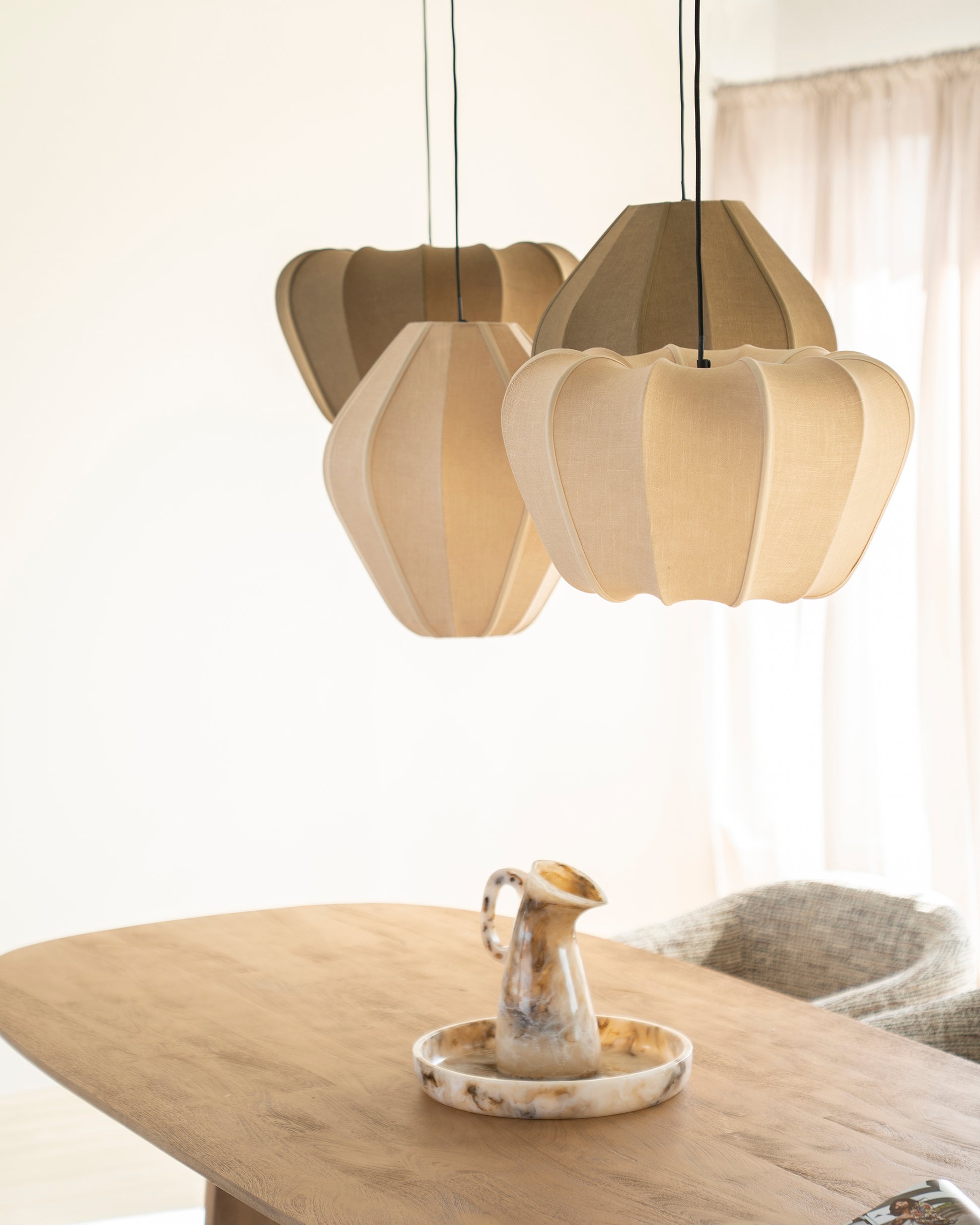 Denne elegante pendellampen kombinerer myke tekstiler med et minimalistisk jernfundament, noe som gir et varmt og organisk uttrykk til ethvert rom. Den skulpturelle formen skaper et behagelig, diffust lys som passer perfekt over spisebordet, i stuen eller i et soverom hvor du ønsker en rolig og innbydende atmosfære.