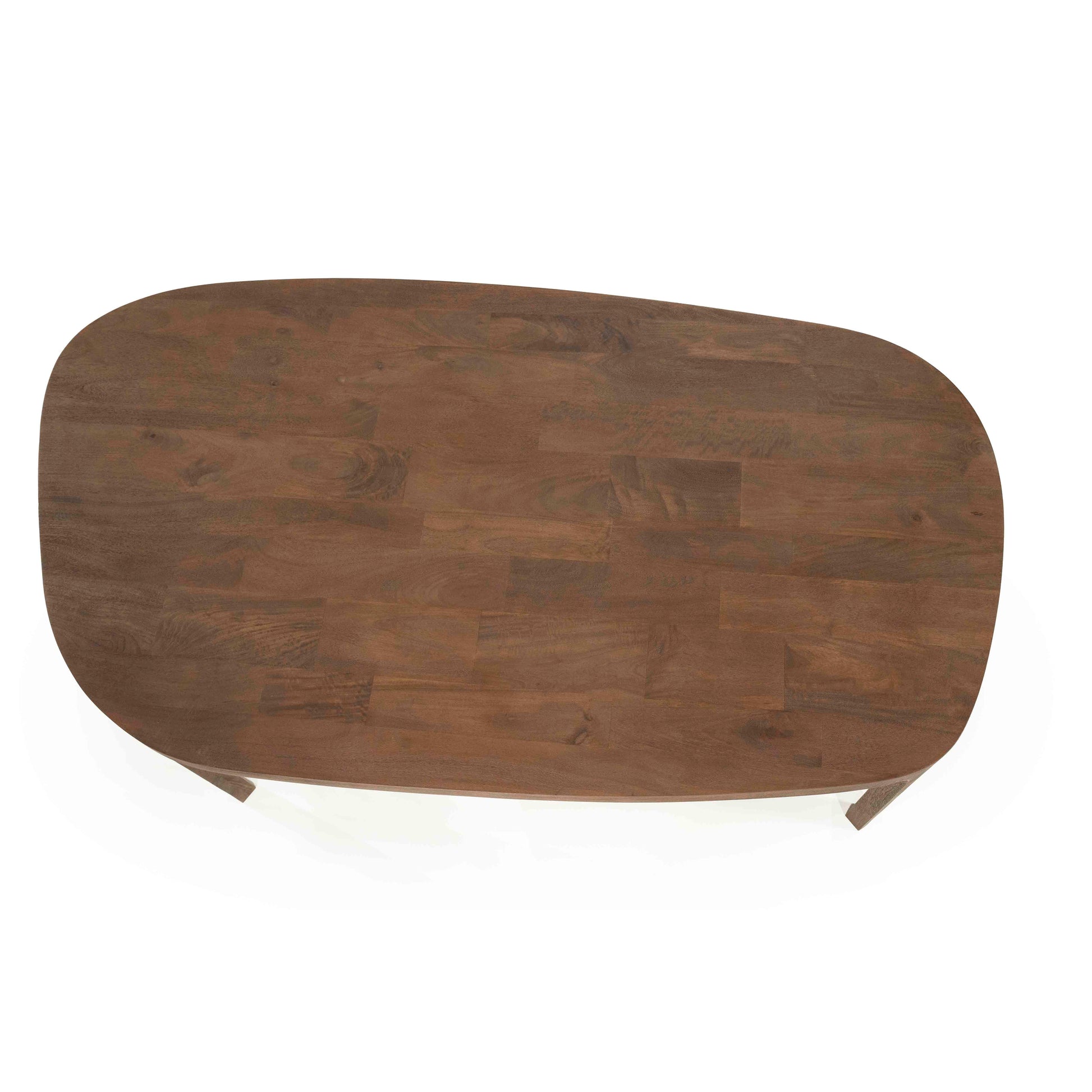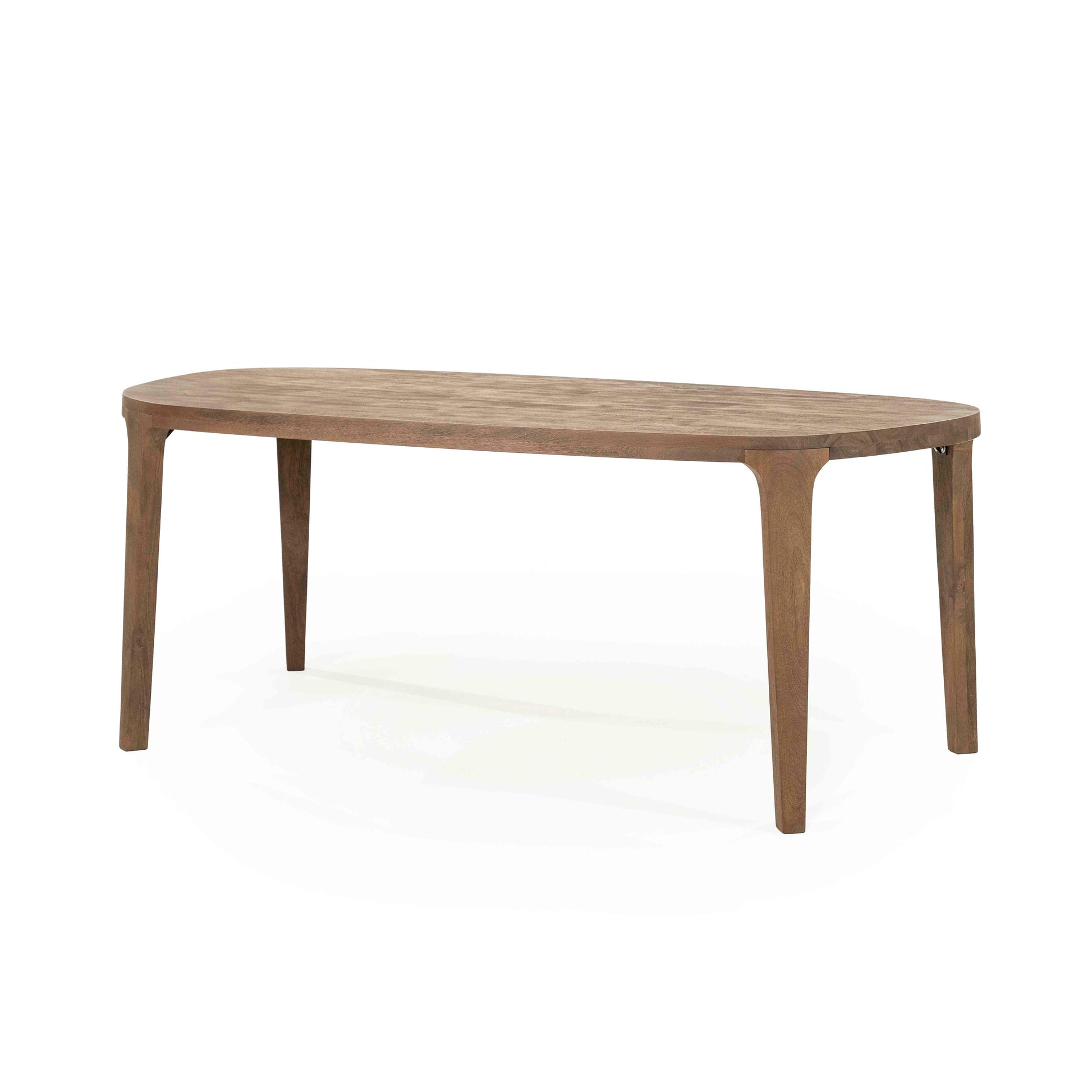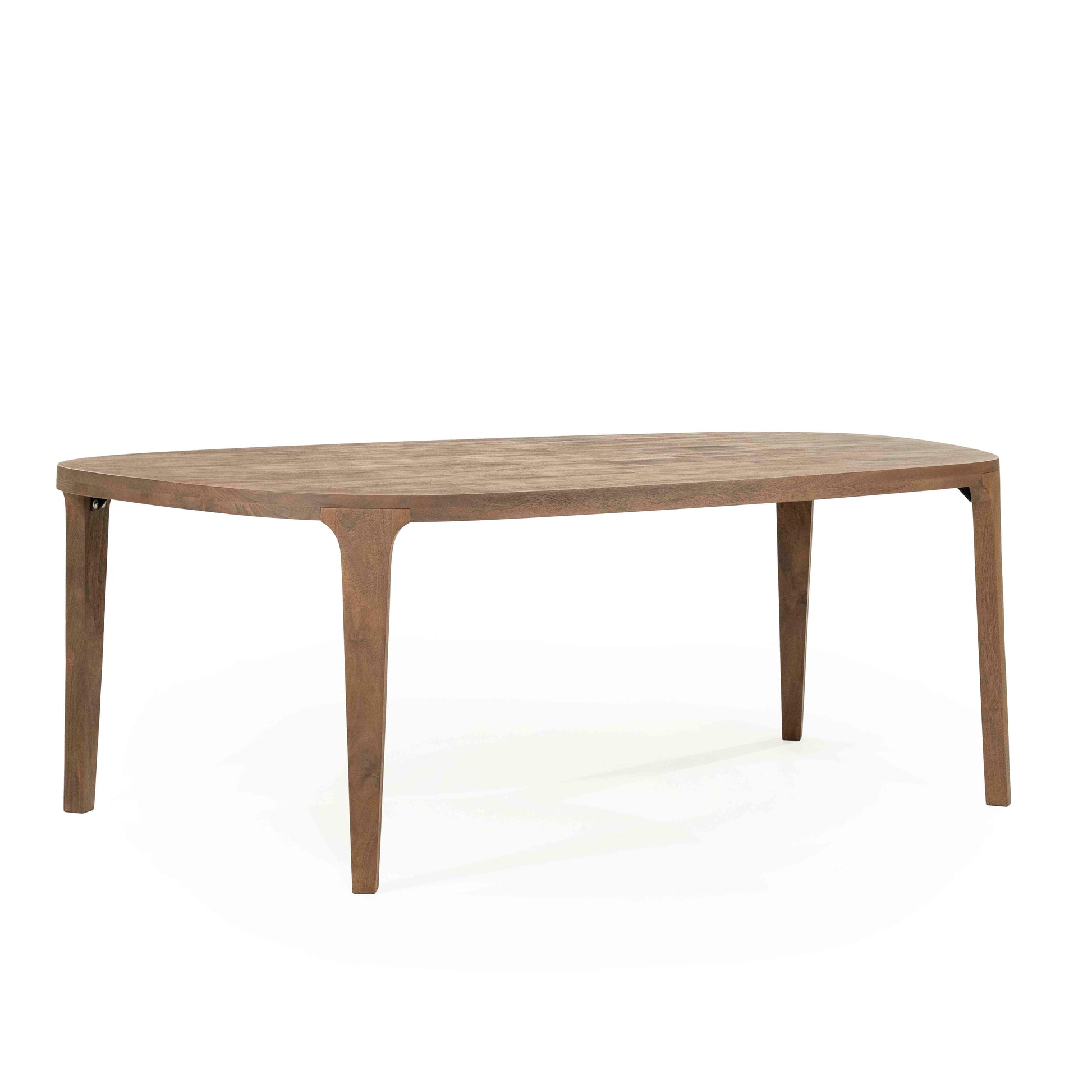 Dette ovale spisebordet i mørkbeiset mangotre kombinerer funksjonalitet med et stilrent design. Bordet har avrundede hjørner og slanke ben som gir det et lett og moderne uttrykk, samtidig som den varme tretonen tilfører rommet en lun og eksklusiv følelse.