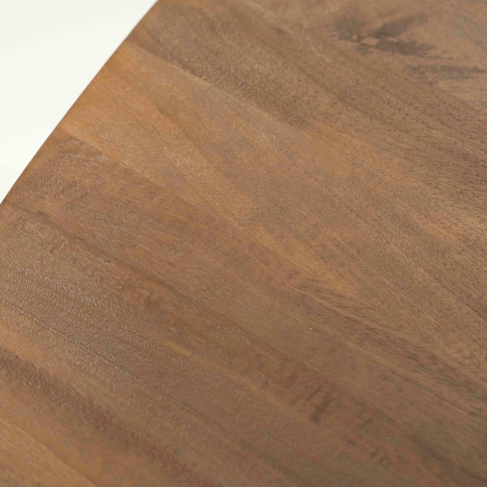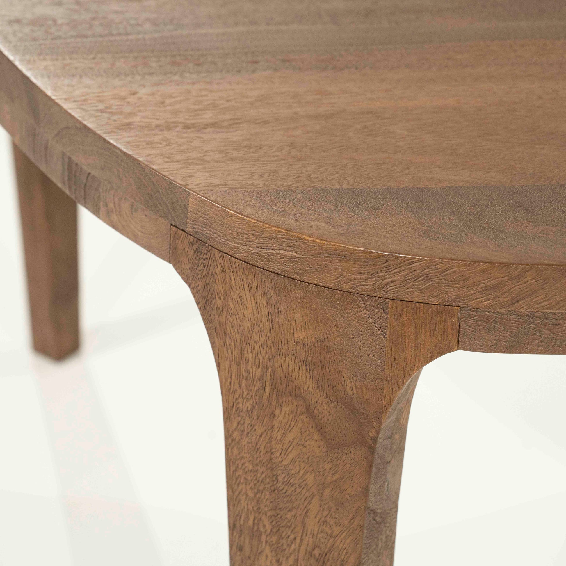 Dette ovale spisebordet i mørkbeiset mangotre kombinerer funksjonalitet med et stilrent design. Bordet har avrundede hjørner og slanke ben som gir det et lett og moderne uttrykk, samtidig som den varme tretonen tilfører rommet en lun og eksklusiv følelse.