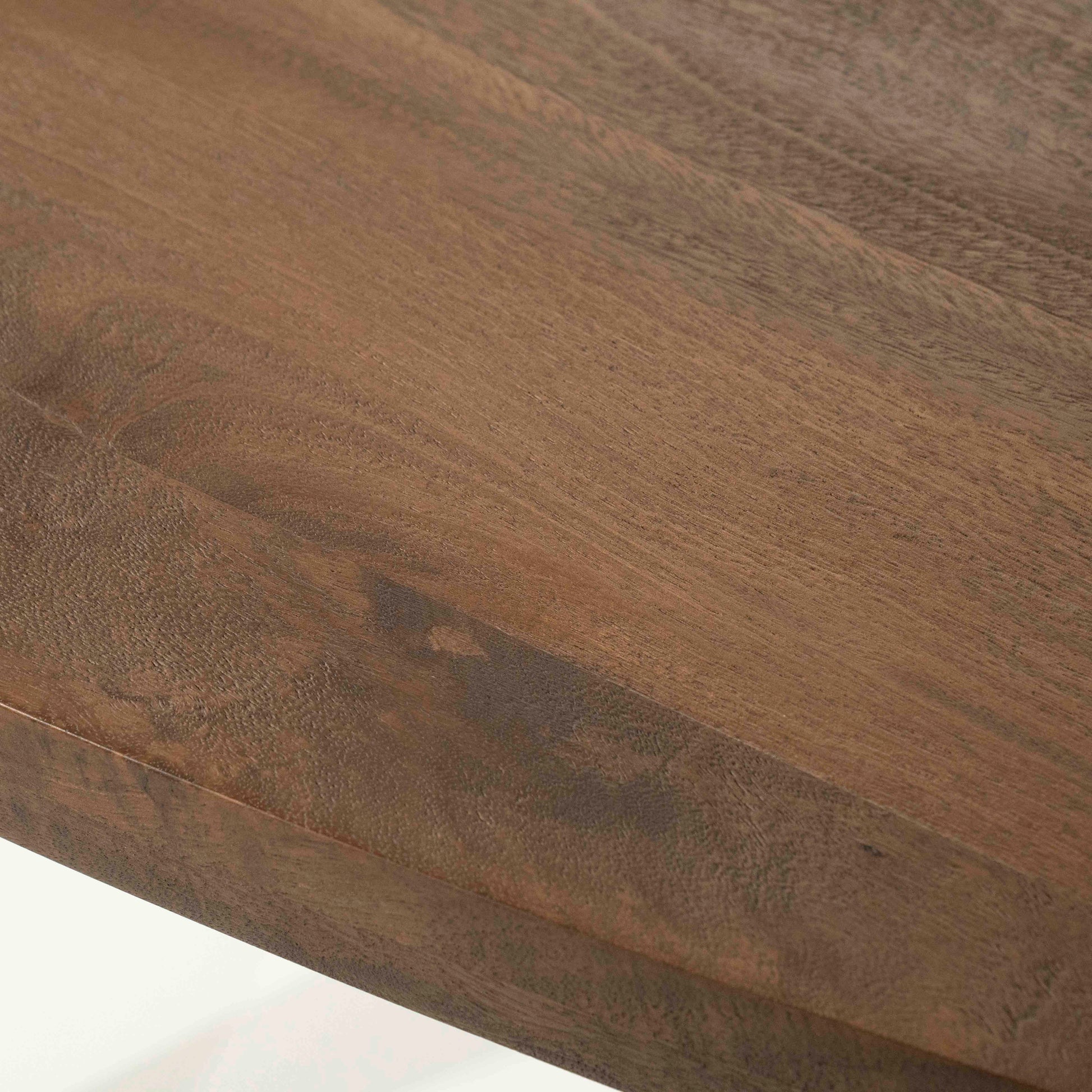 Dette ovale spisebordet i mørkbeiset mangotre kombinerer funksjonalitet med et stilrent design. Bordet har avrundede hjørner og slanke ben som gir det et lett og moderne uttrykk, samtidig som den varme tretonen tilfører rommet en lun og eksklusiv følelse.