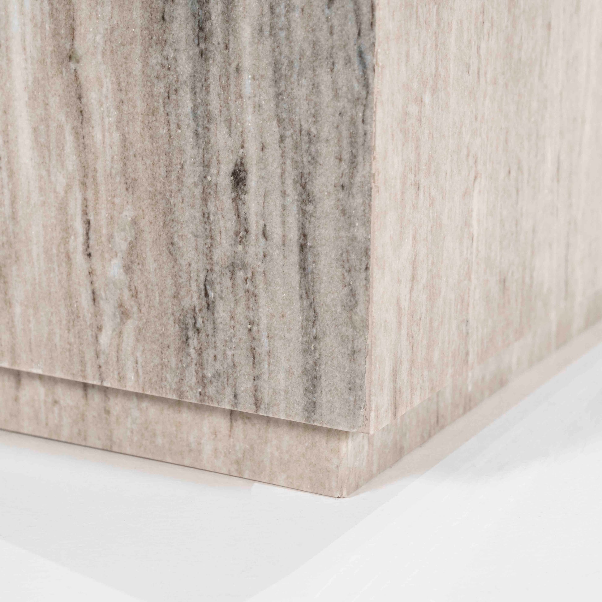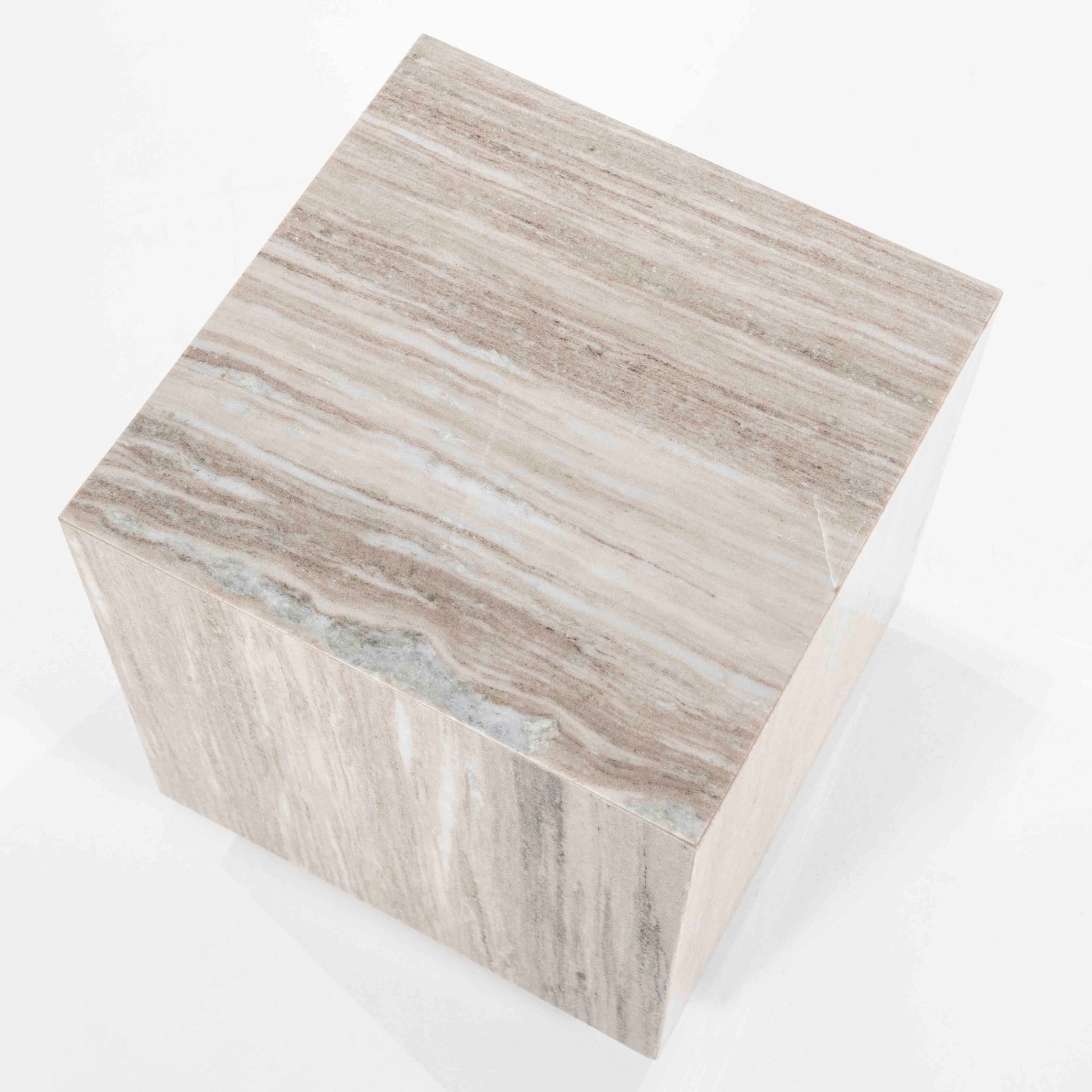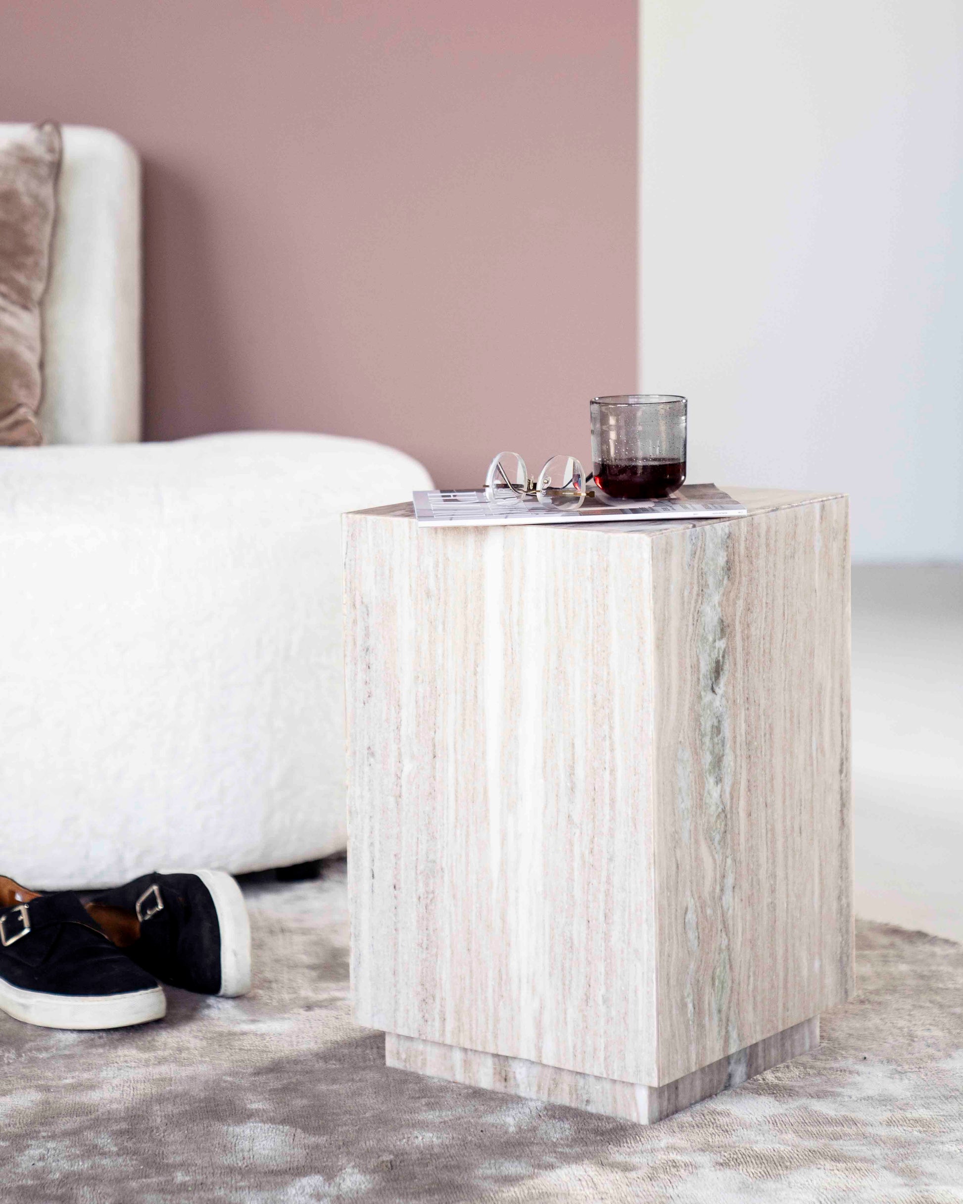 Et moderne og tidløst sidebord laget i vakker marmorstein. Den rette, kubeformede silhuetten fremhever steinens naturlige årer og fargespill, som varierer i nyanser av beige, grått og krem. Hver bordflate har sitt unike uttrykk, noe som gjør hvert møbel helt unikt.