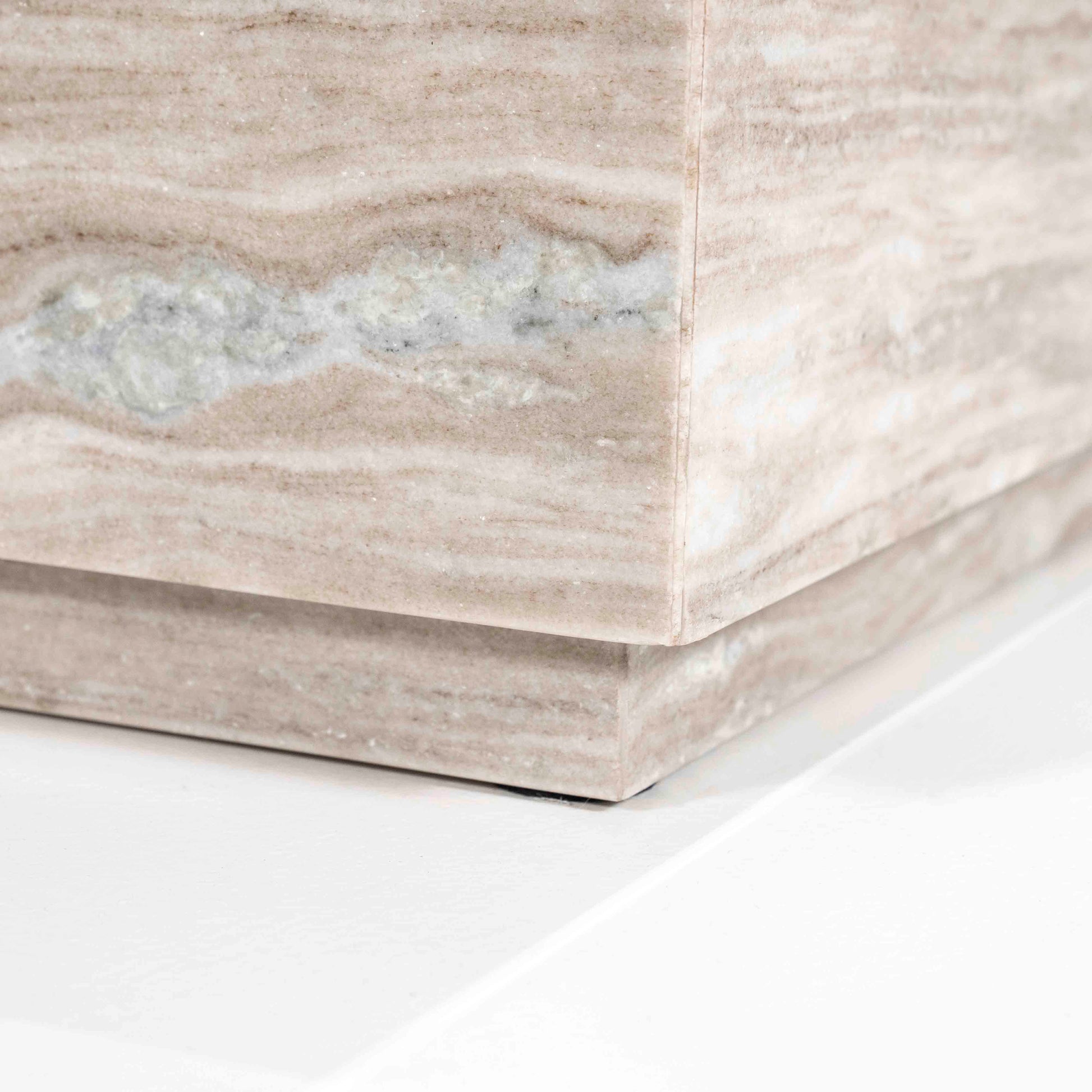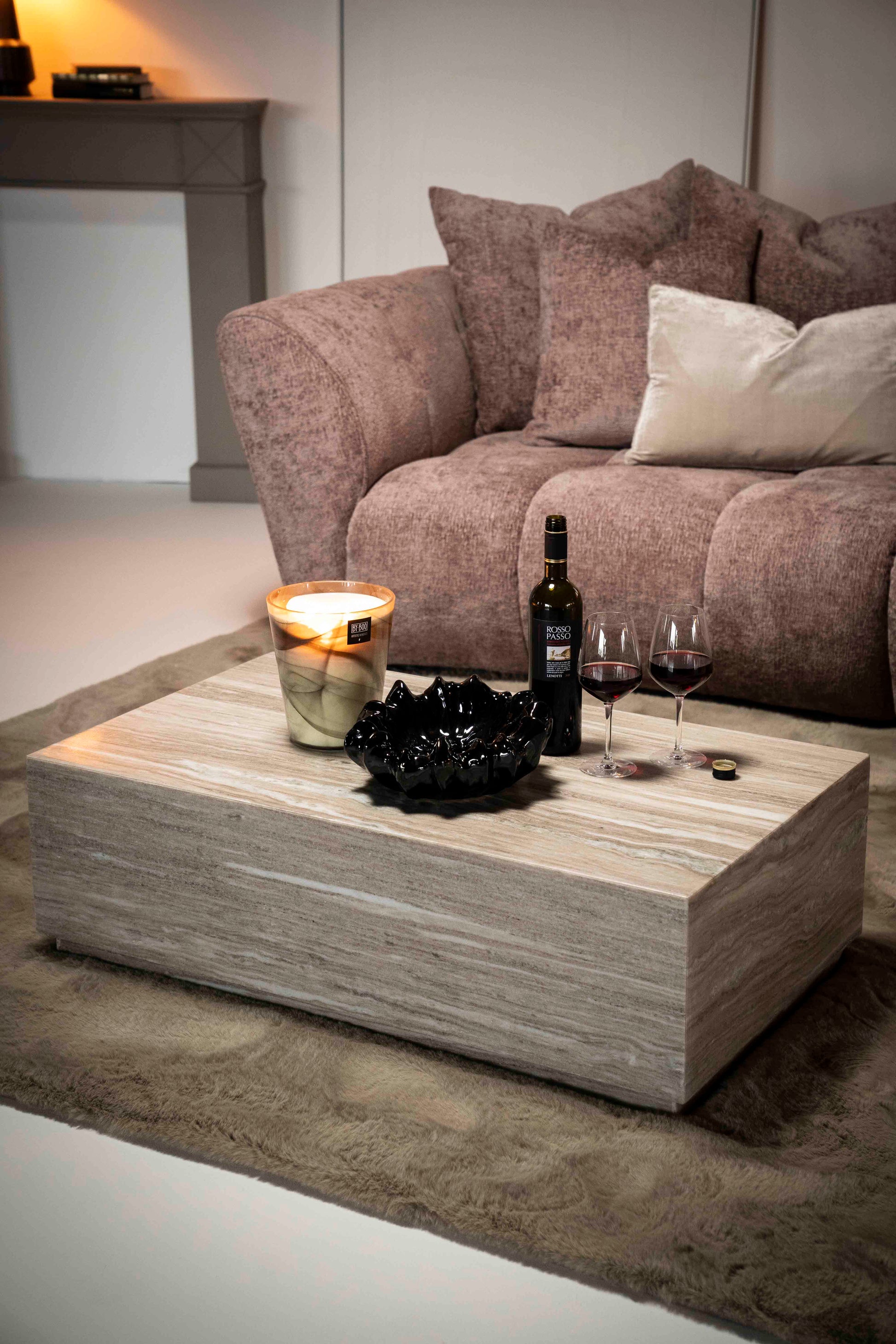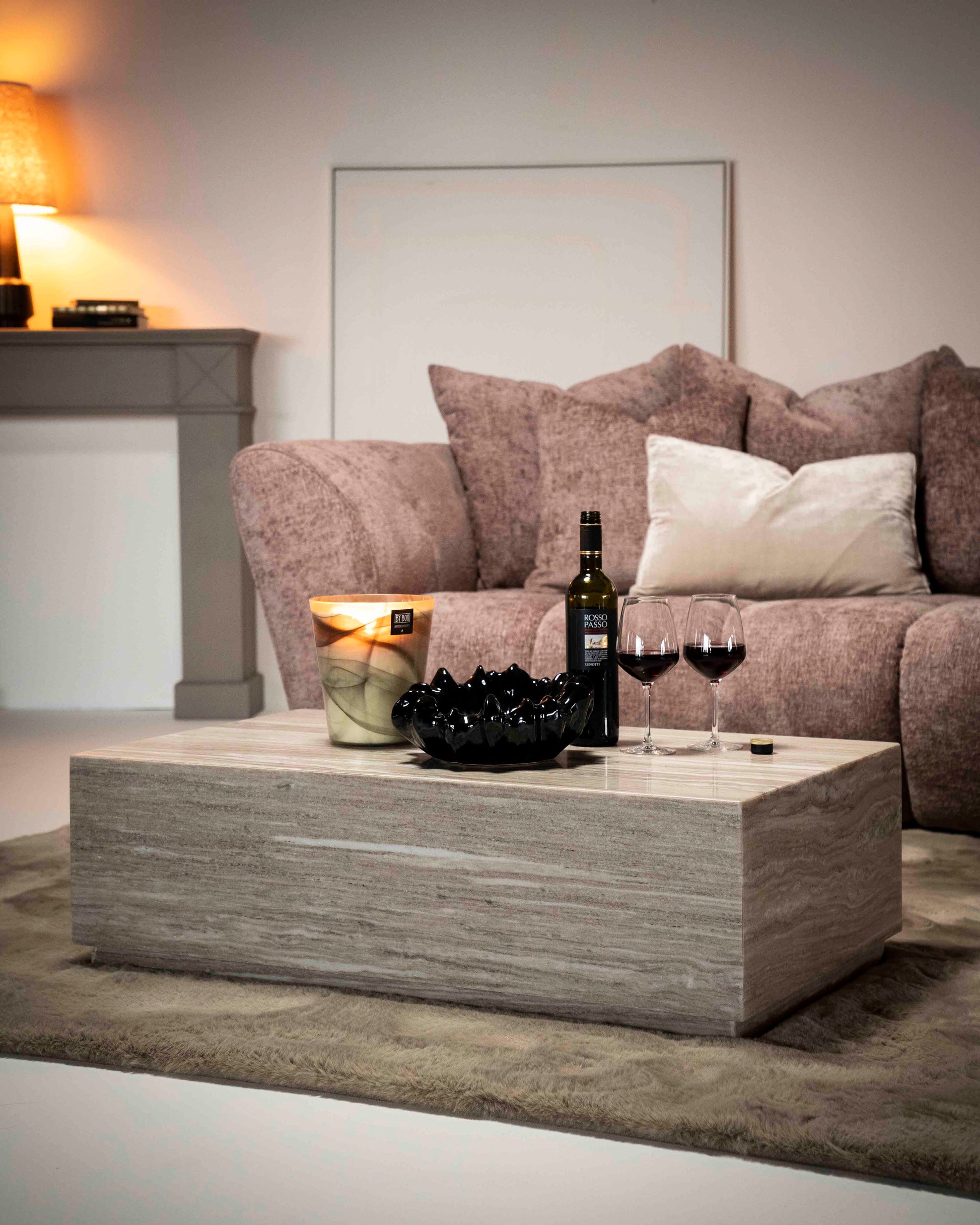 Et eksklusivt salongbord laget i hel naturstein (marmor), med et minimalistisk og moderne uttrykk. Den rektangulære formen fremhever steinens vakre årer og unike struktur, med naturlige variasjoner i nyanser av beige, grått og hvitt.