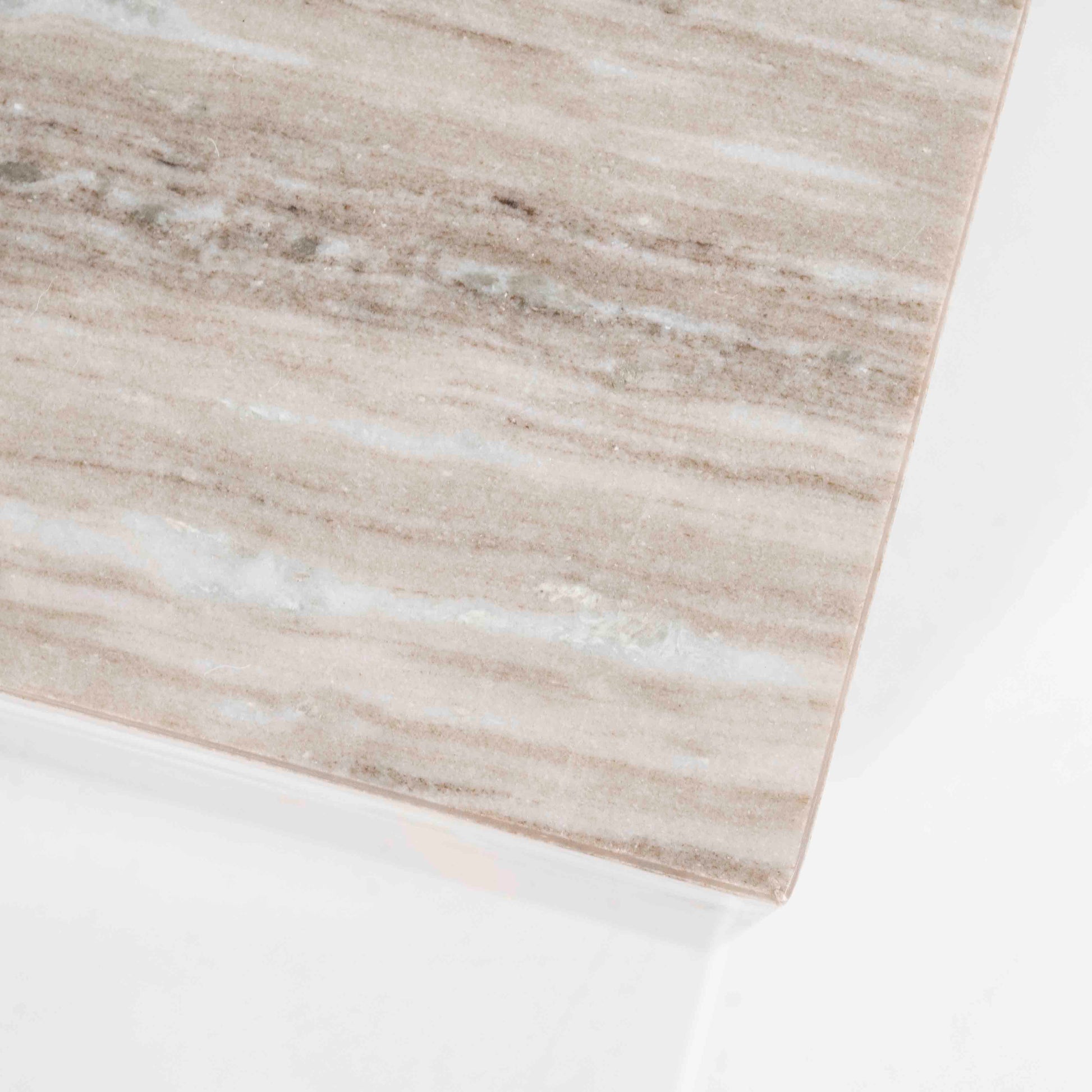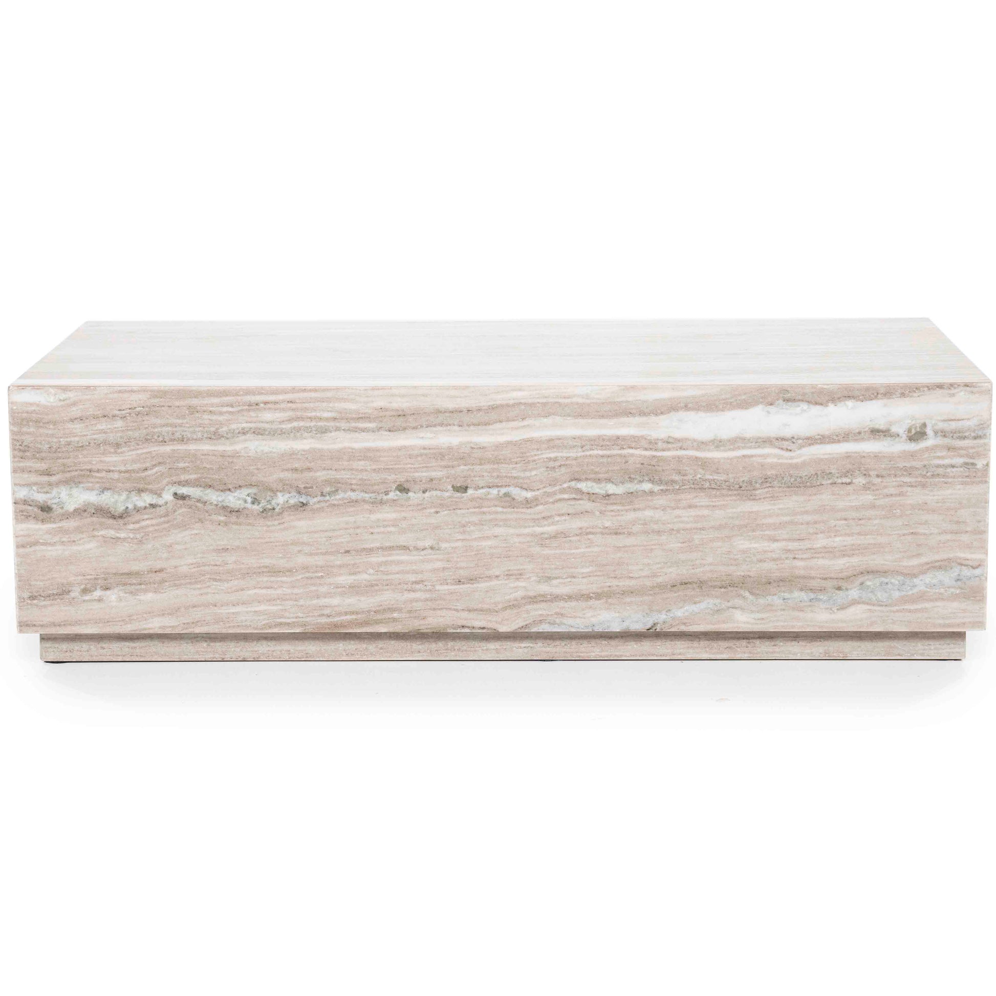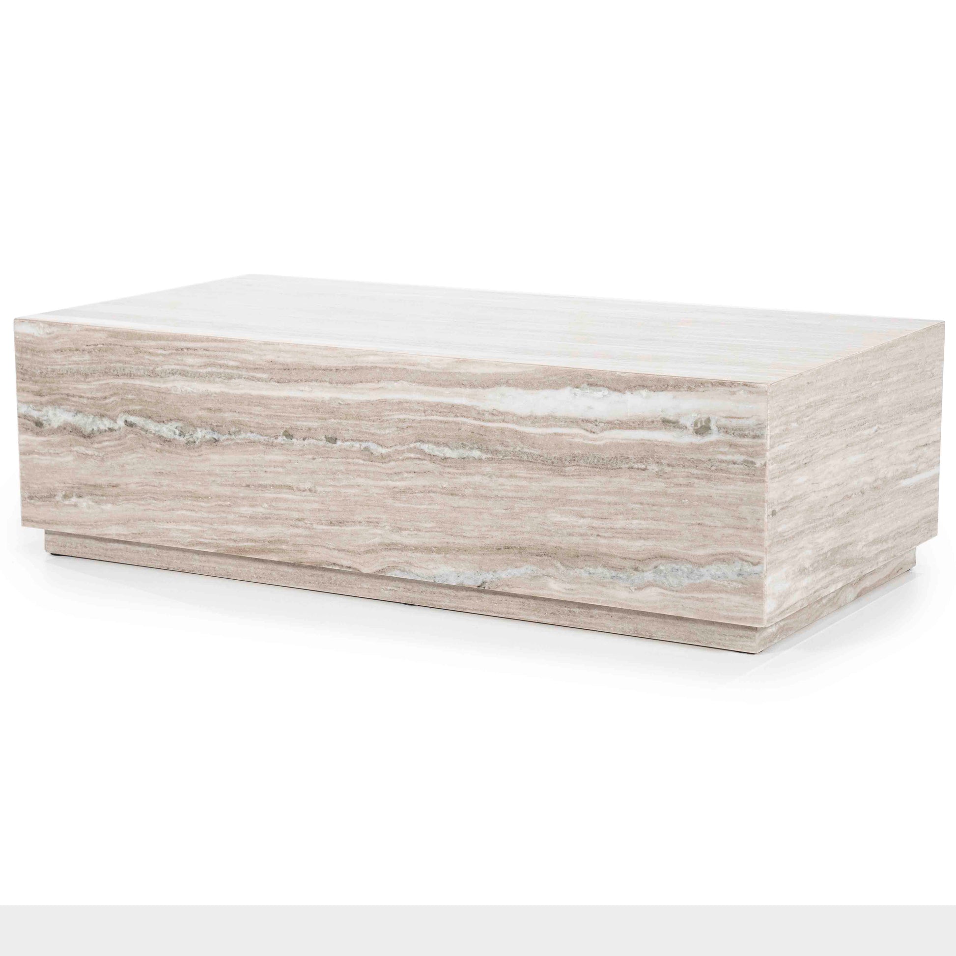 Et eksklusivt salongbord laget i hel naturstein (marmor), med et minimalistisk og moderne uttrykk. Den rektangulære formen fremhever steinens vakre årer og unike struktur, med naturlige variasjoner i nyanser av beige, grått og hvitt.