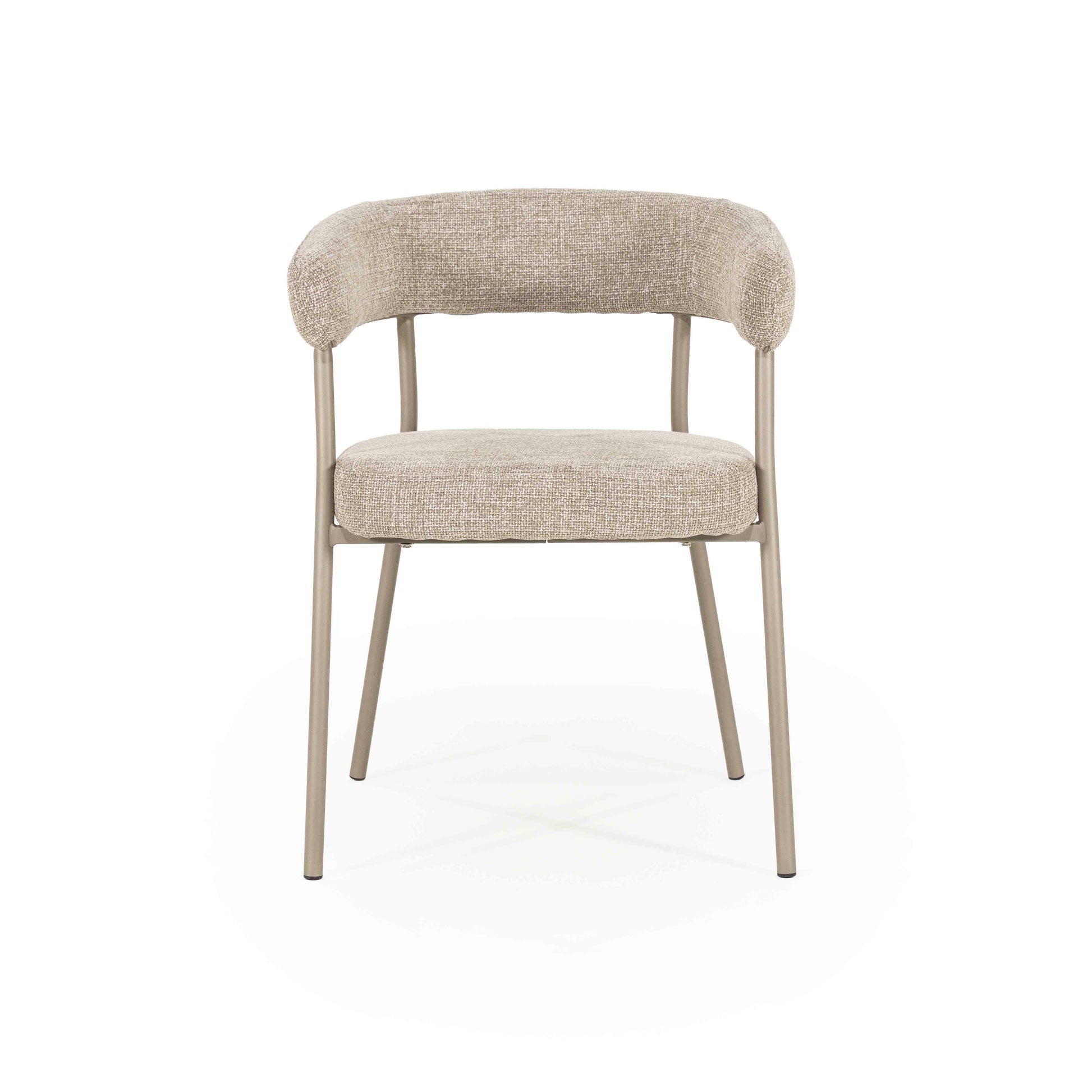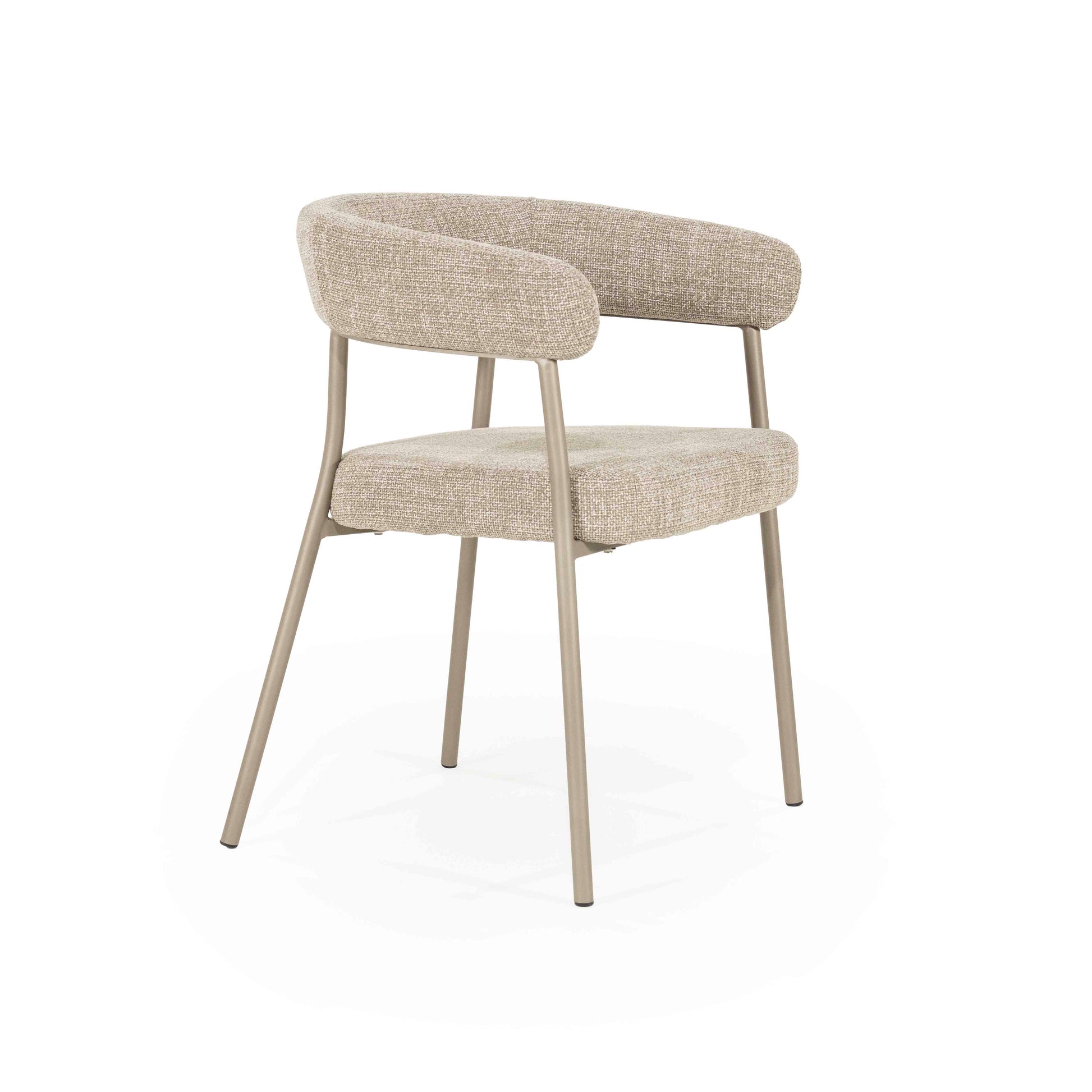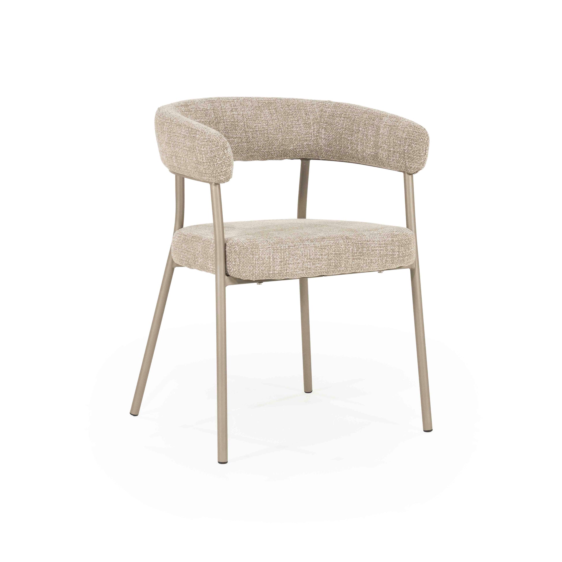 En stilren og moderne spisestol som kombinerer eleganse og komfort på en perfekt måte. Den lyse metallrammen gir et lett og luftig uttrykk, mens det polstrede setet og den buede ryggstøtten med armlener sørger for behagelig sittekomfort. Den nøytrale beige/brune fargen passer sømløst inn i både lyse og varme interiører.